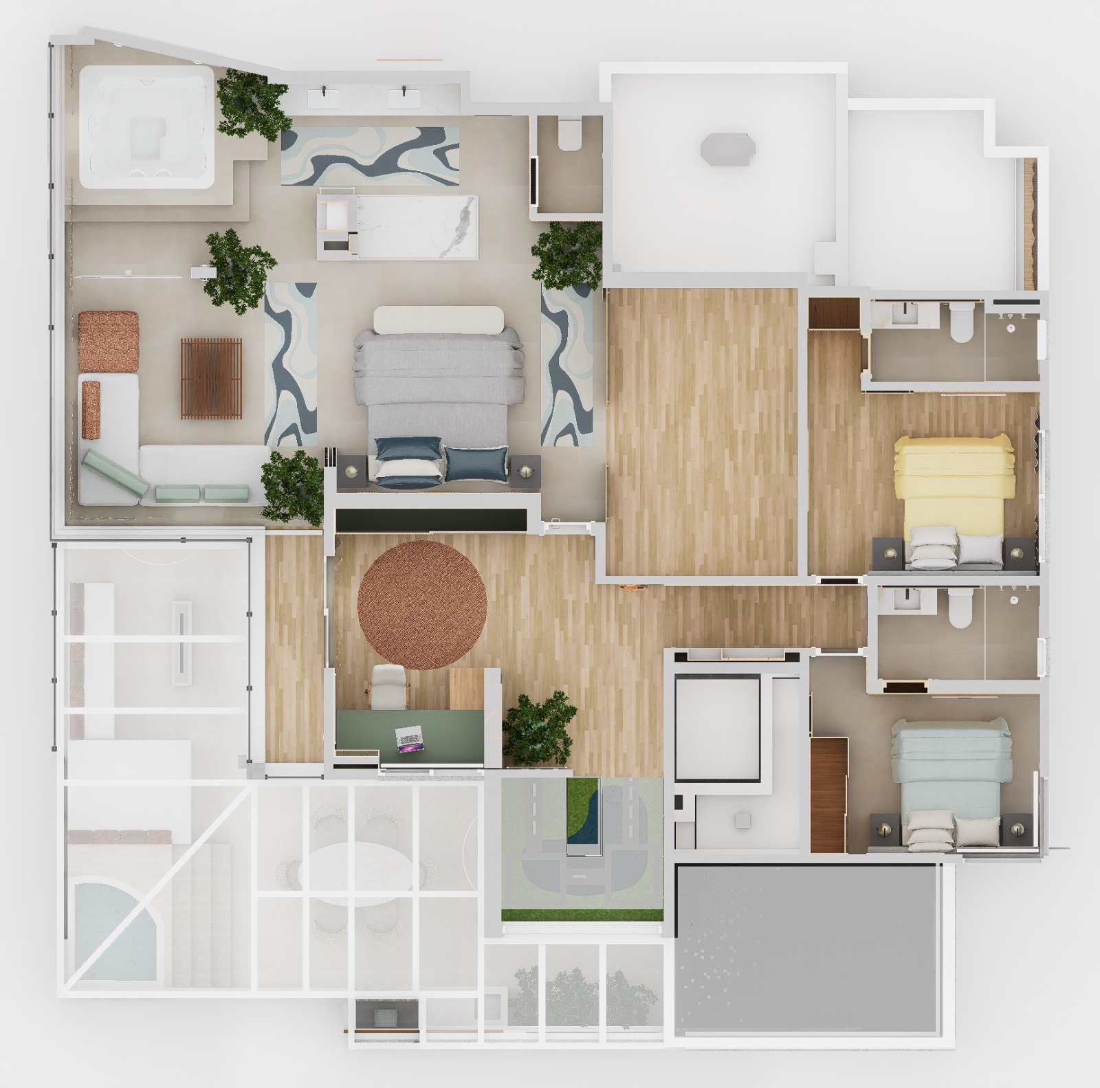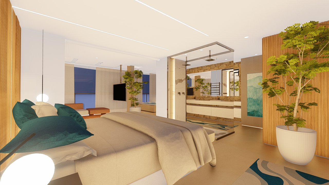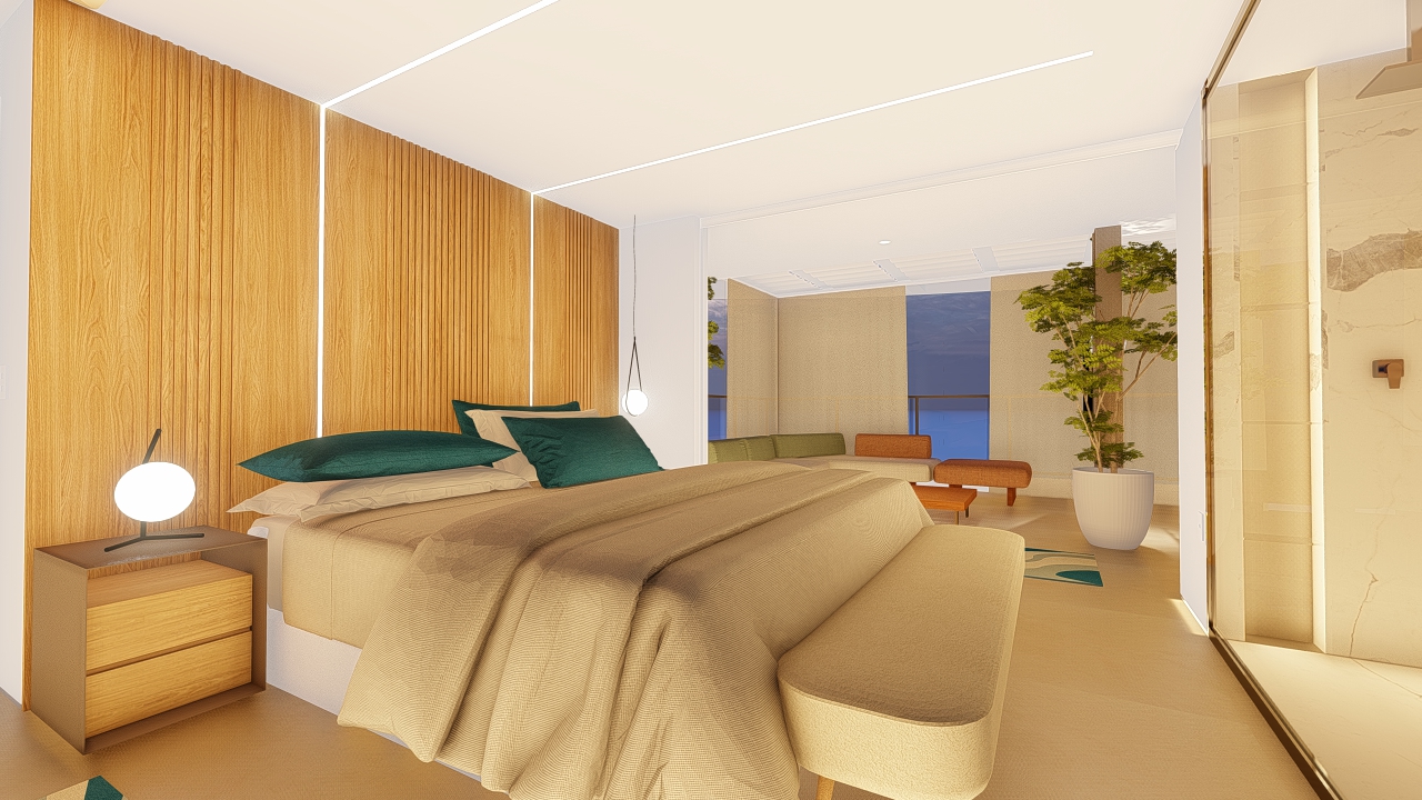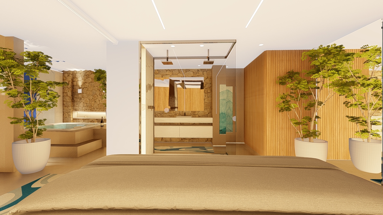 No setor íntimo, o quarto master será integrado ao banheiro, criando um ambiente mais amplo e sofisticado, onde será possível ter visão direta do banheiro e da área externa, proporcionando uma sensação de spa privativo.