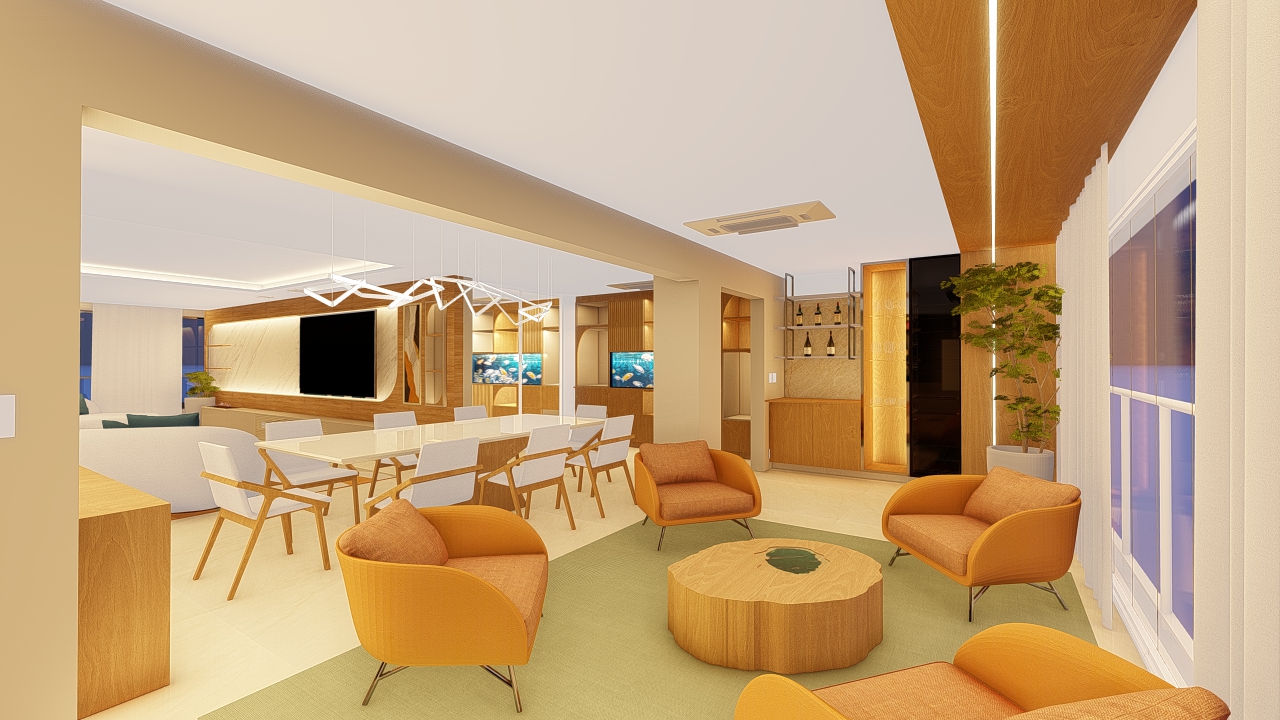 Na sala de estar, o objetivo foi promover maior integração e aconchego, mantendo como destaque o grande aquário existente, que passa a ser um elemento central na composição do novo ambiente. A integração entre a sala e a varanda amplia a percepção de espaço e conecta os ambientes de forma fluida. Além disso, será feita a substituição completa do piso, buscando um acabamento mais atual e elegante.