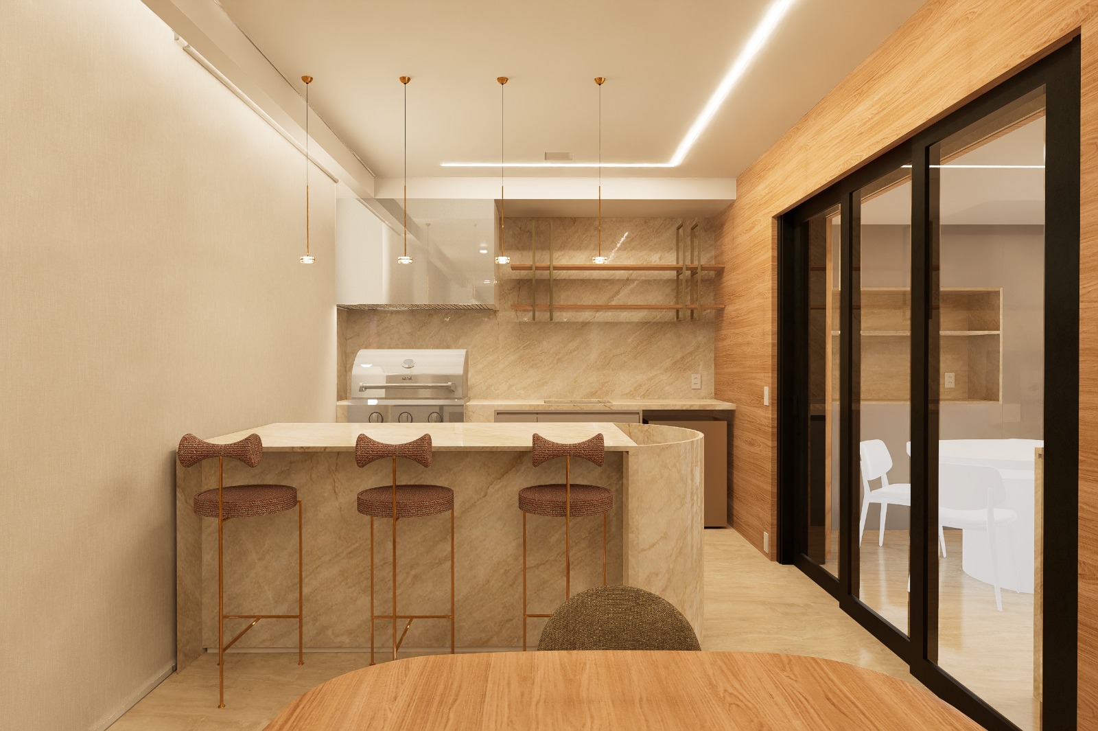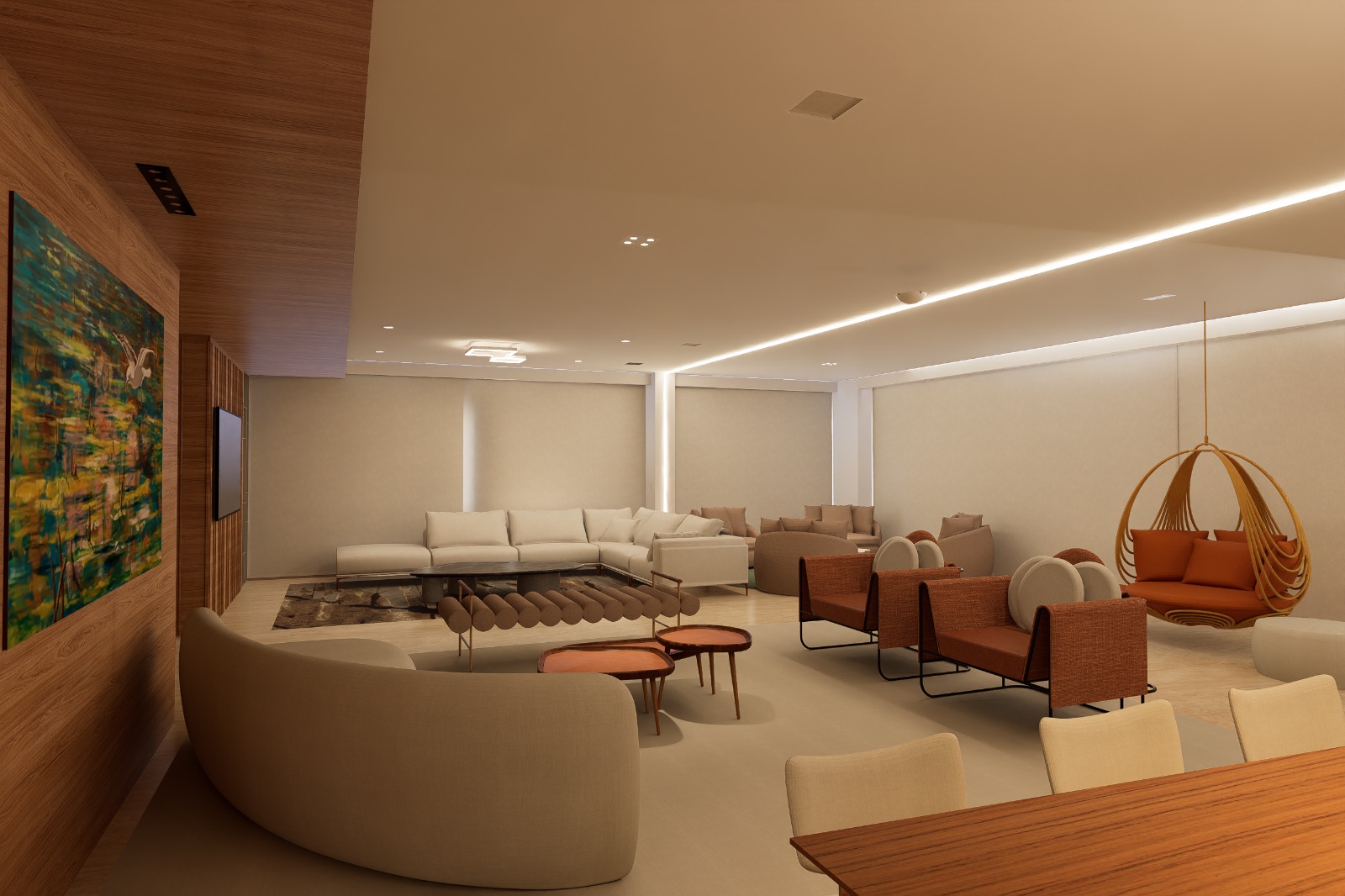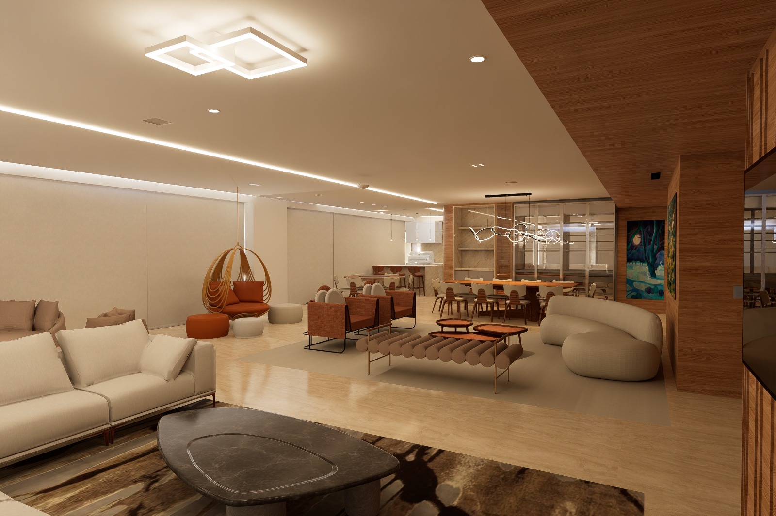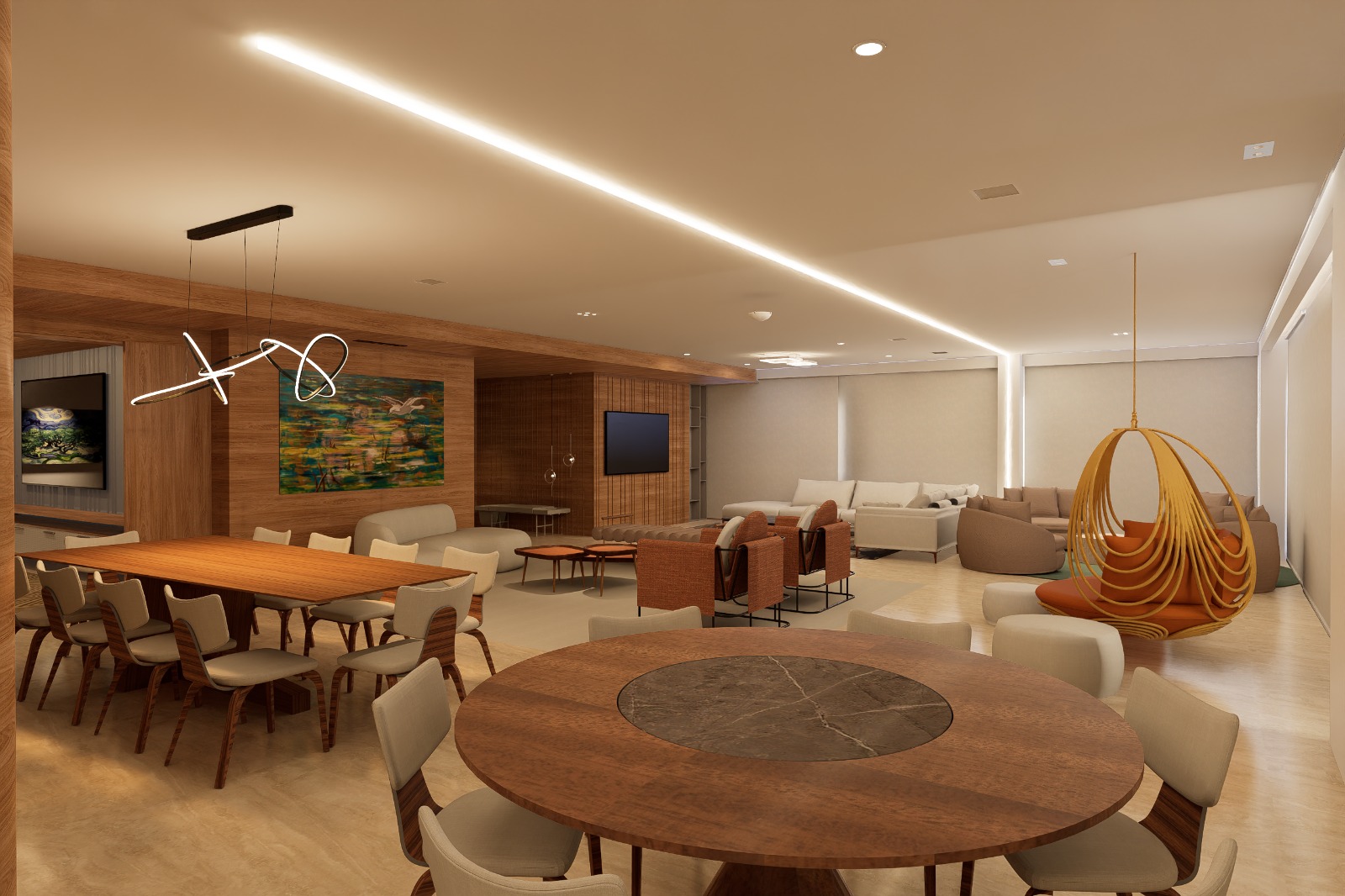 Os espaços sociais foram totalmente integrados: sala de estar, jantar, área gourmet, sala de TV e um elegante fire place se conectam de forma fluida, potencializando a sensação de amplitude e convivência.