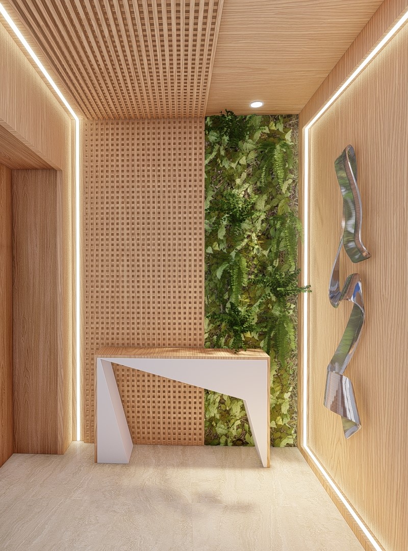 A decoração da sala impressiona com cores marcantes e peças autênticas, como os estofados em tons terrosos com designs imponentes, que equilibram conforto e personalidade. Os painéis de madeira dialogam com o mármore, criando um contraste de texturas que enriquece o espaço.