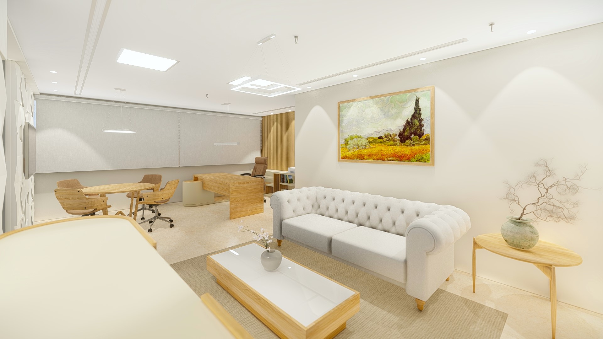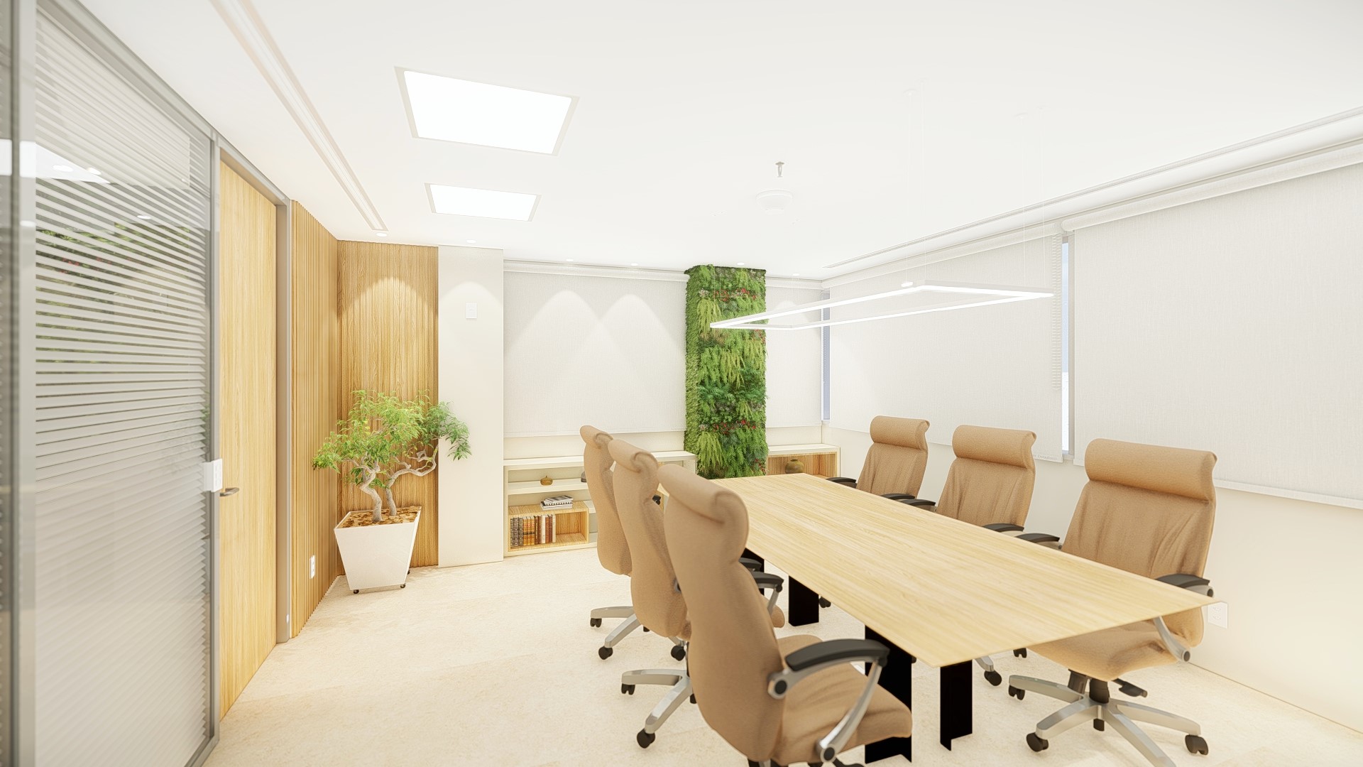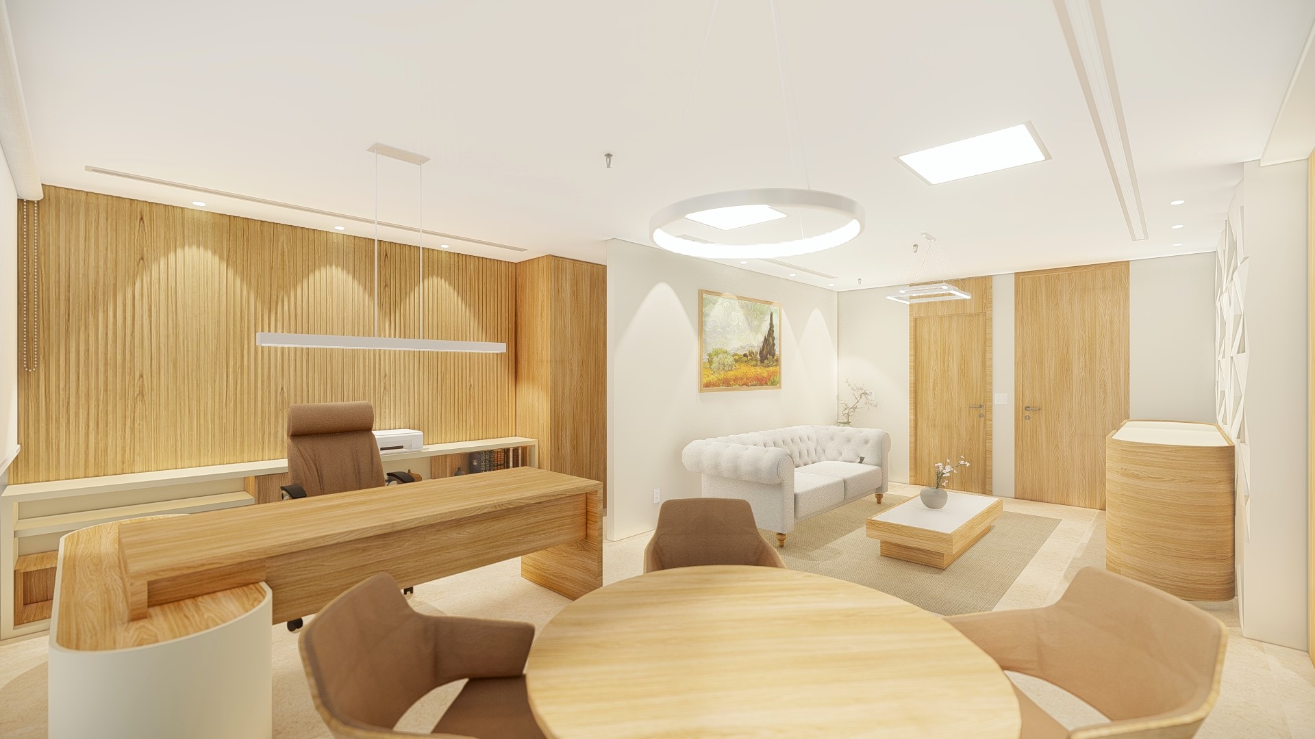 A sala de reuniões foi projetada como um espaço dinâmico, onde decisões estratégicas são tomadas em um ambiente que inspira confiança e criatividade. Já a área da diretoria reflete exclusividade e sofisticação, com mobiliário de alta qualidade e elementos decorativos que reforçam a personalidade da empresa.