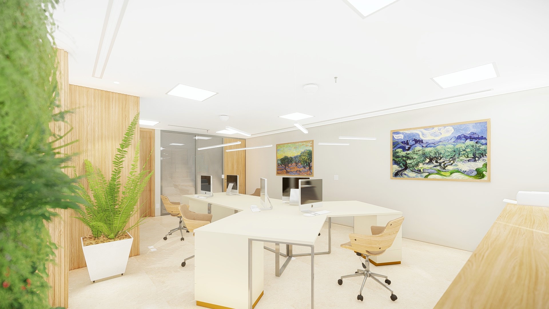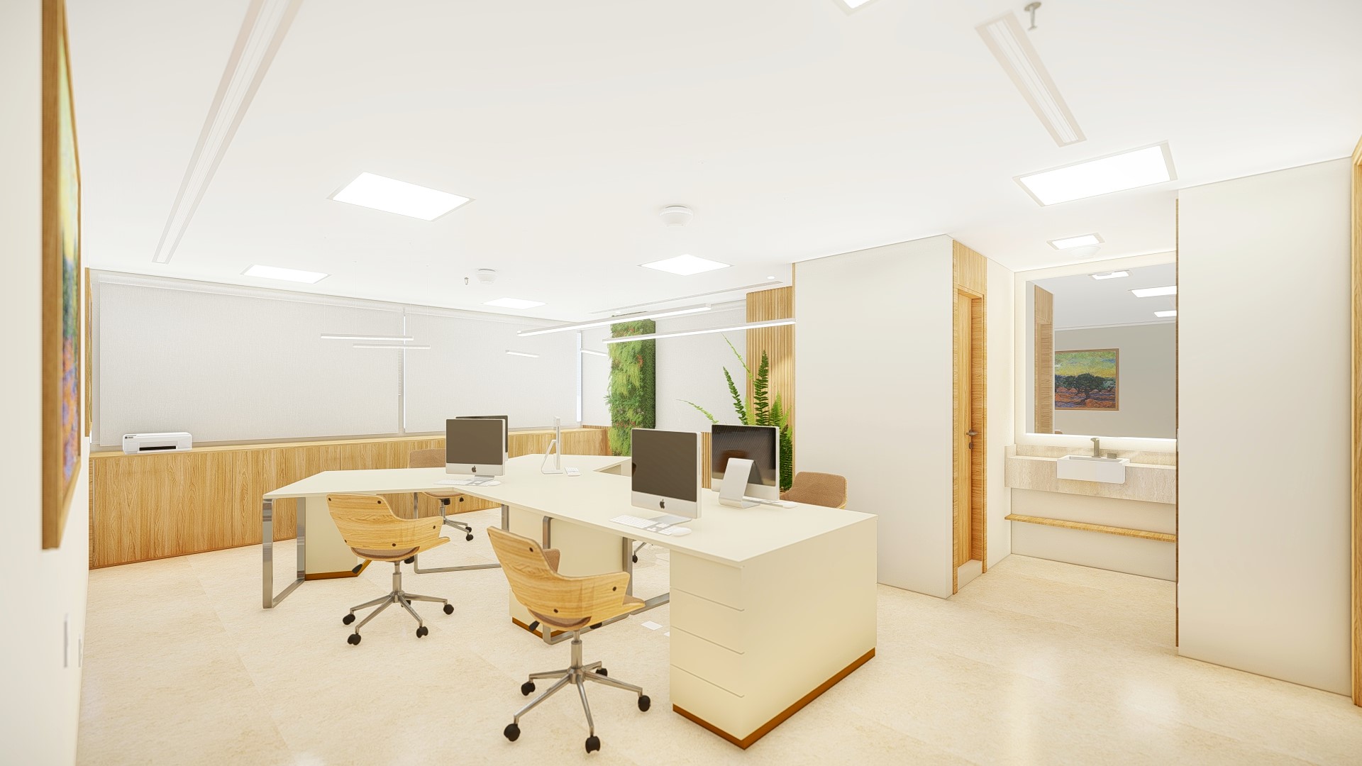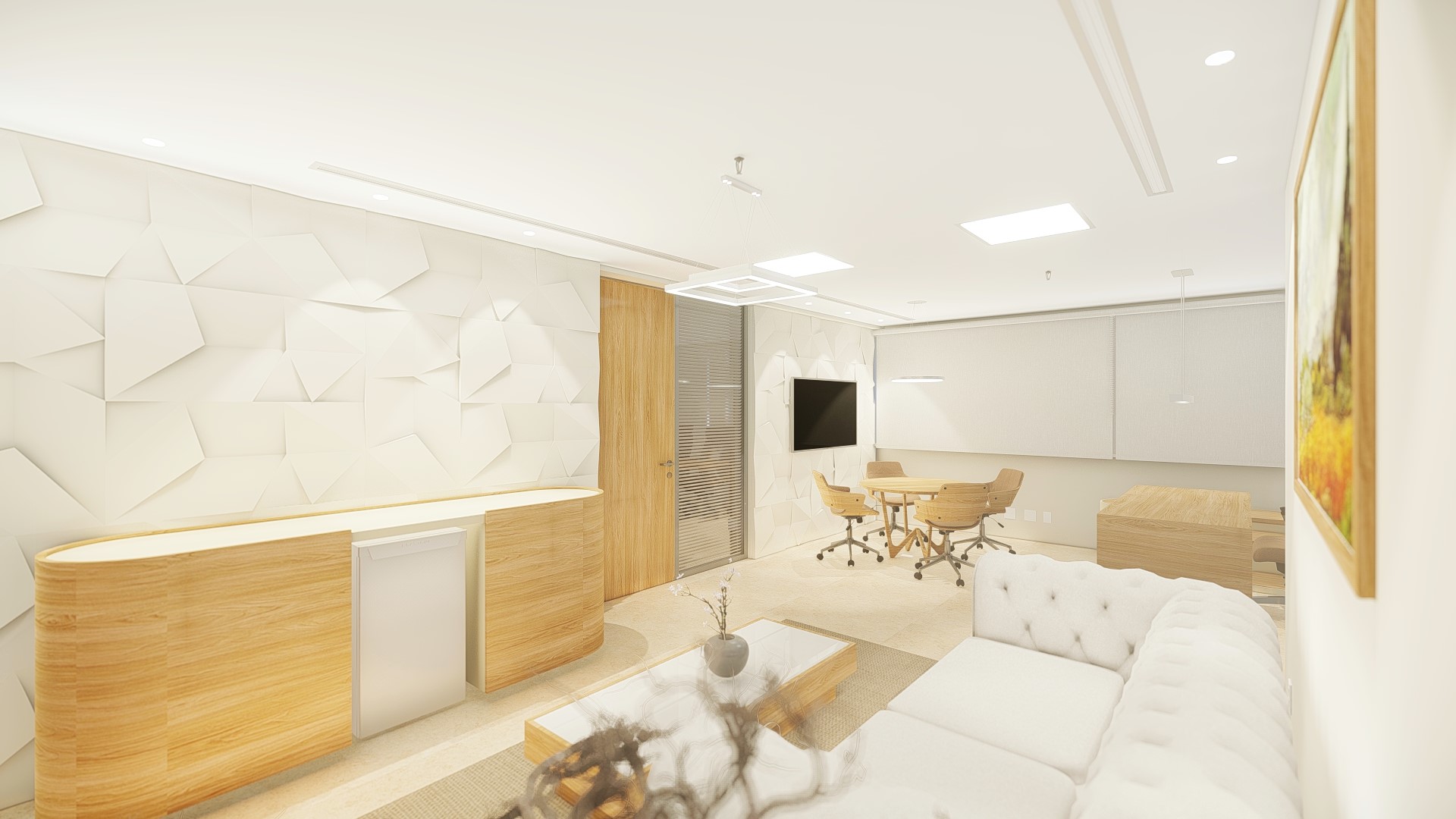 Neste projeto, recepção é o primeiro contato com a marca, e por isso, apostamos em linhas puras, iluminação estratégica e materiais nobres, criando um ambiente acolhedor e confortável. Nas áreas operacionais, as estações de trabalho foram dispostas de forma a favorecer a comunicação entre equipes.