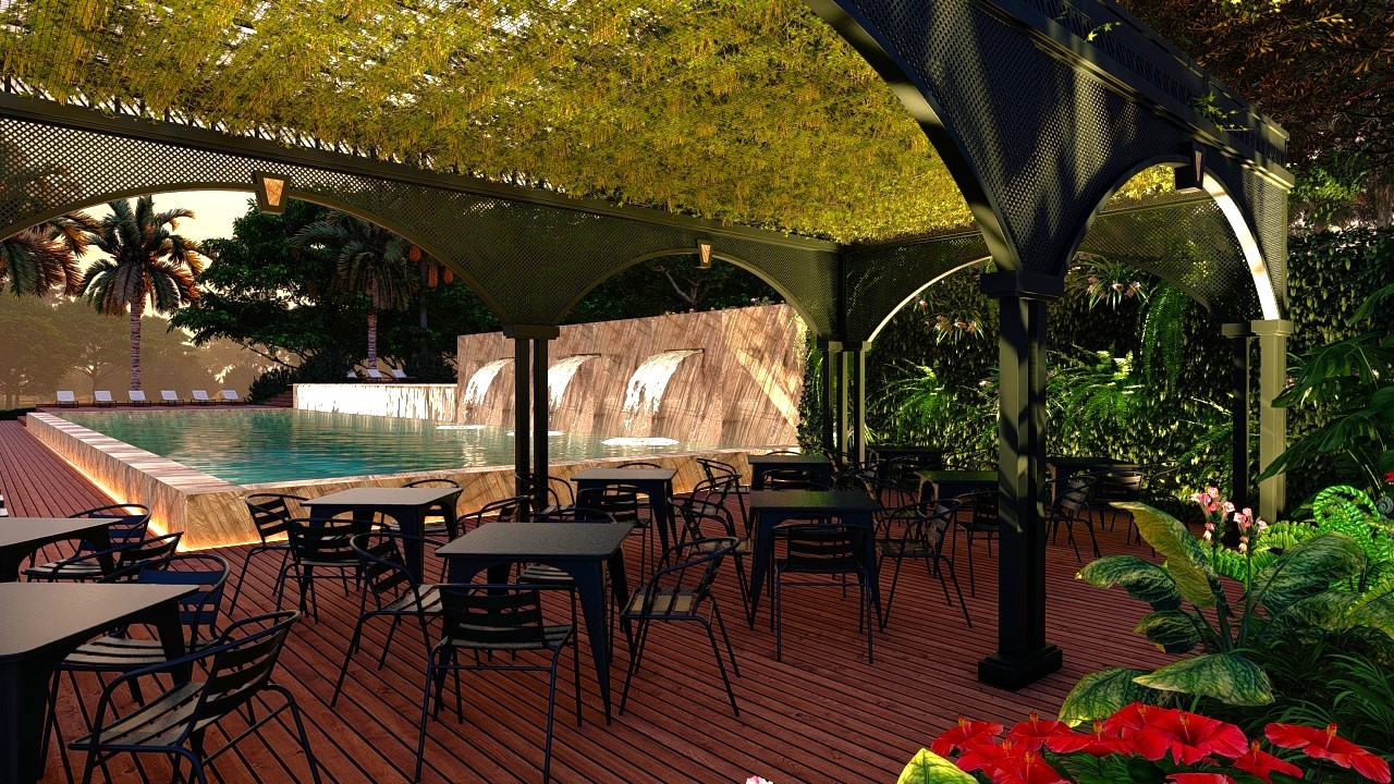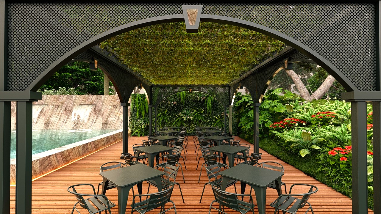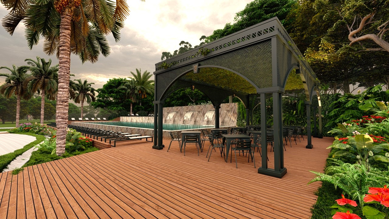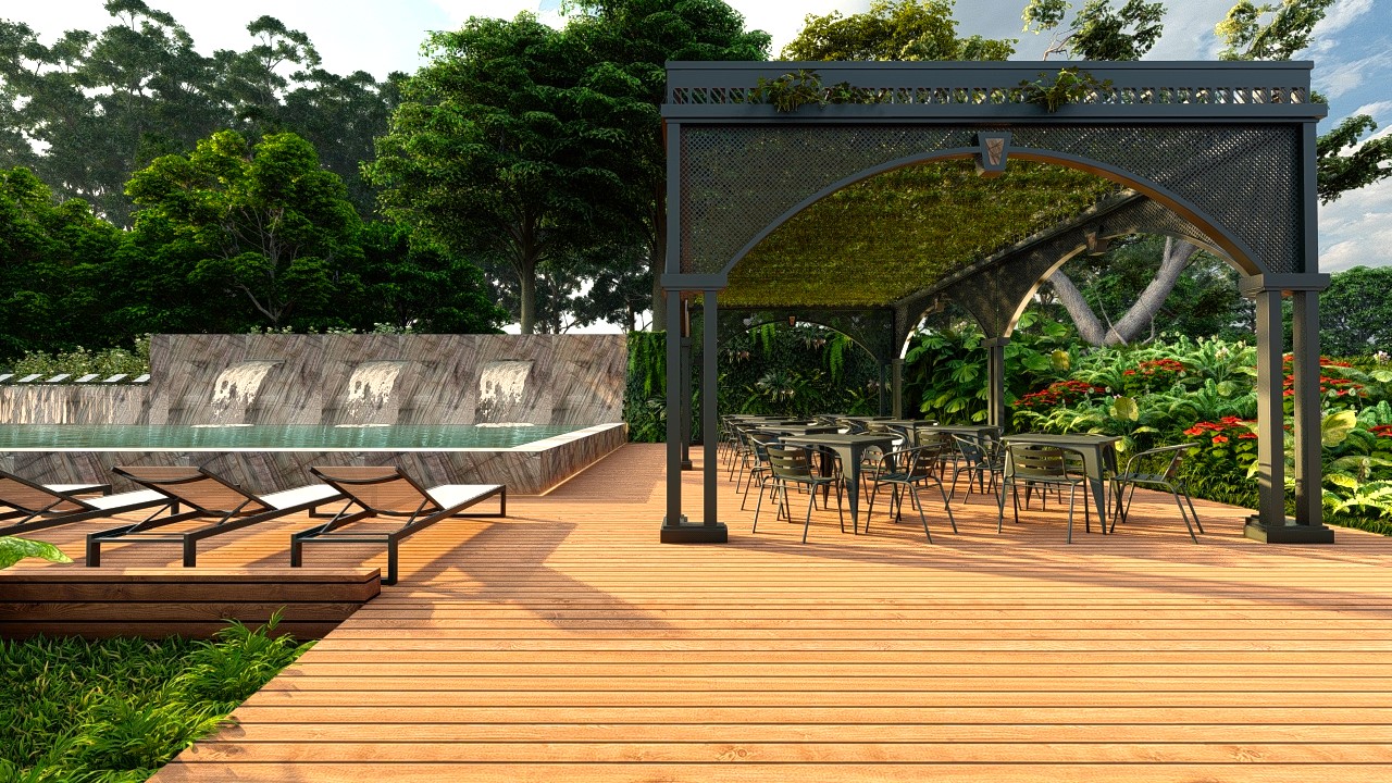 O gazebo metálico, valorizado pelo padrão vazado de sua cobertura, projeta sombras dinâmicas durante o dia e abriga o espaço social que acompanha a piscina. O teto é preenchido por vegetação trepadeira, que não apenas realça o frescor do ambiente, mas também reforça a integração do espaço com a natureza ao redor.