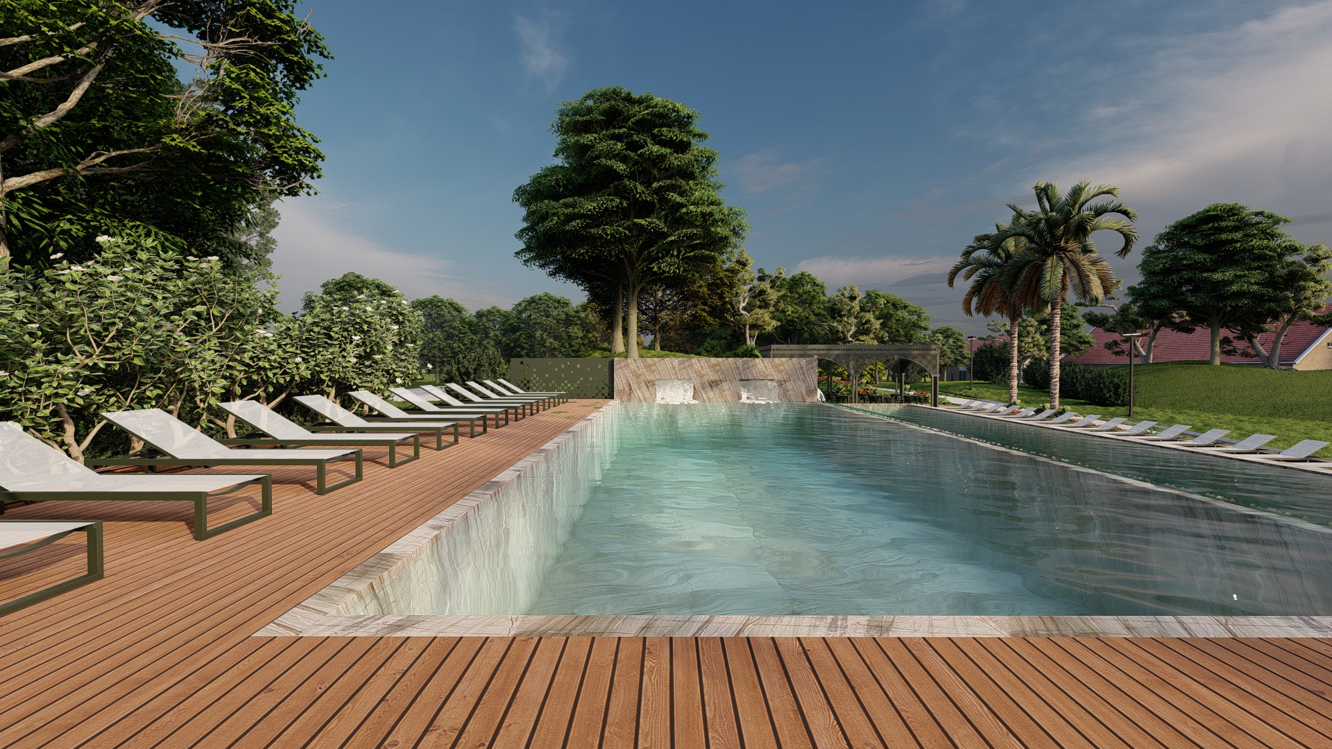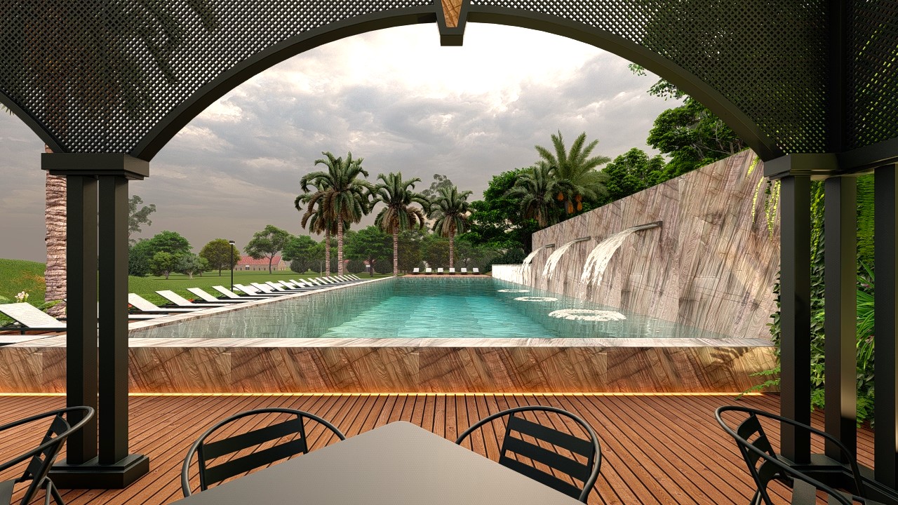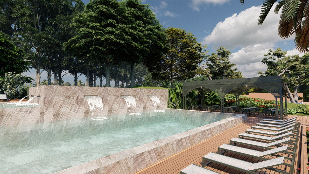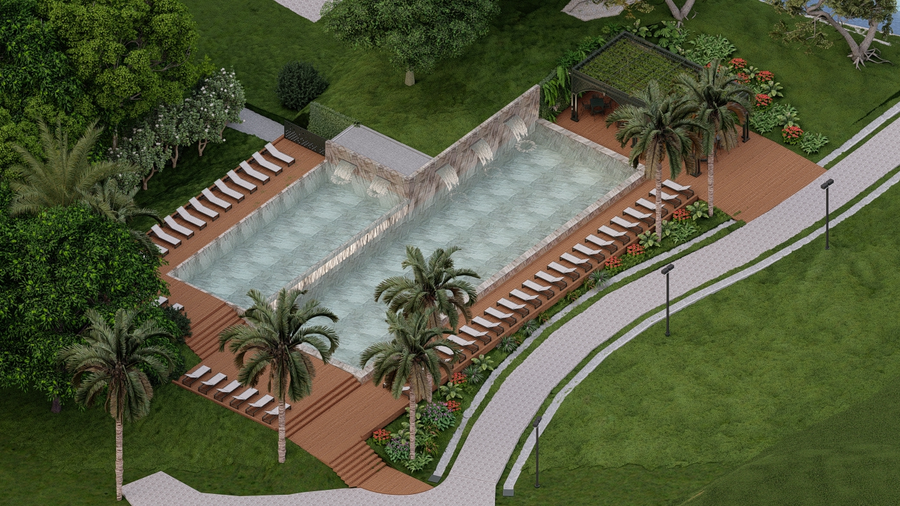 O projeto da piscina do resort se apresenta como um local de relaxamento e contemplação, enriquecendo a experiência dos visitantes.