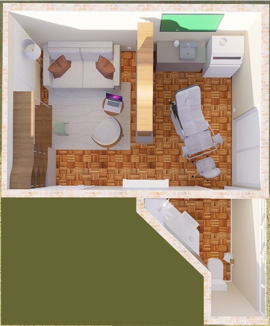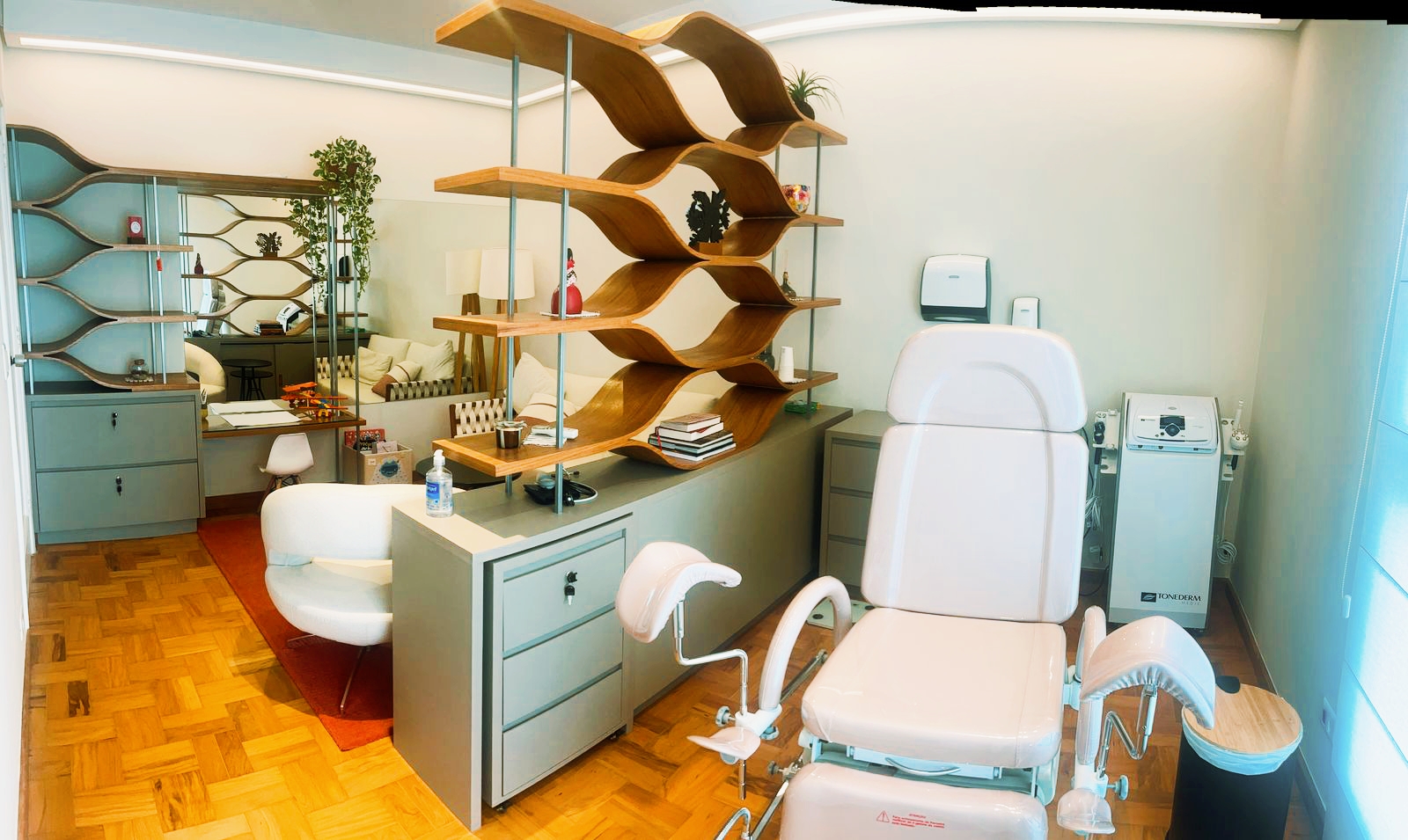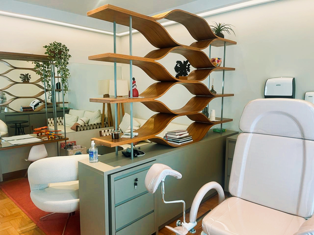O resultado é um ambiente que transcende a funcionalidade convencional de um consultório, transformando-se em um espaço de acolhimento e bem-estar.
