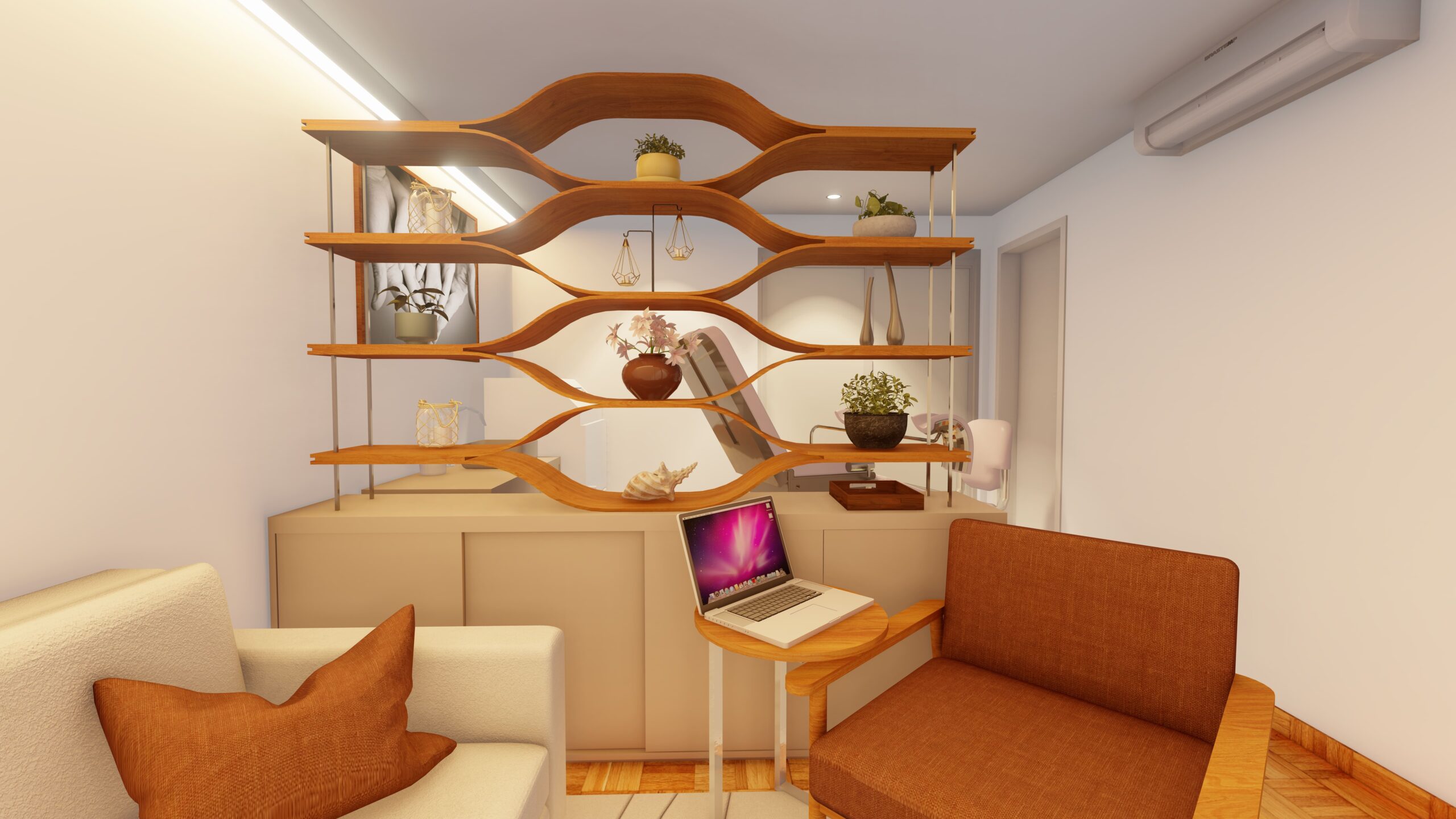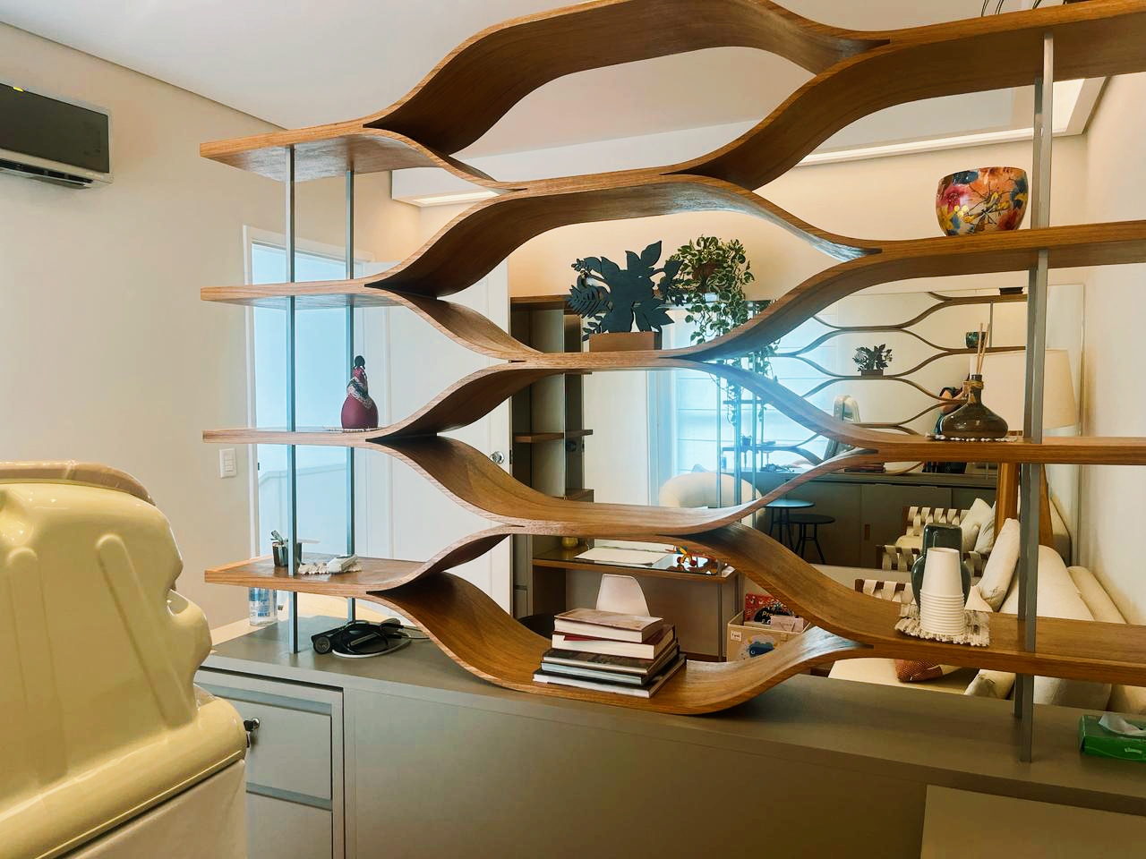 O design se fundamenta em uma paleta de tons neutros e materiais naturais, criando uma atmosfera de serenidade. A marcenaria orgânica, com prateleiras esculpidas em formas fluidas, não apenas setoriza os ambientes sem comprometer a amplitude espacial, mas também adicionam um elemento escultural ao projeto.