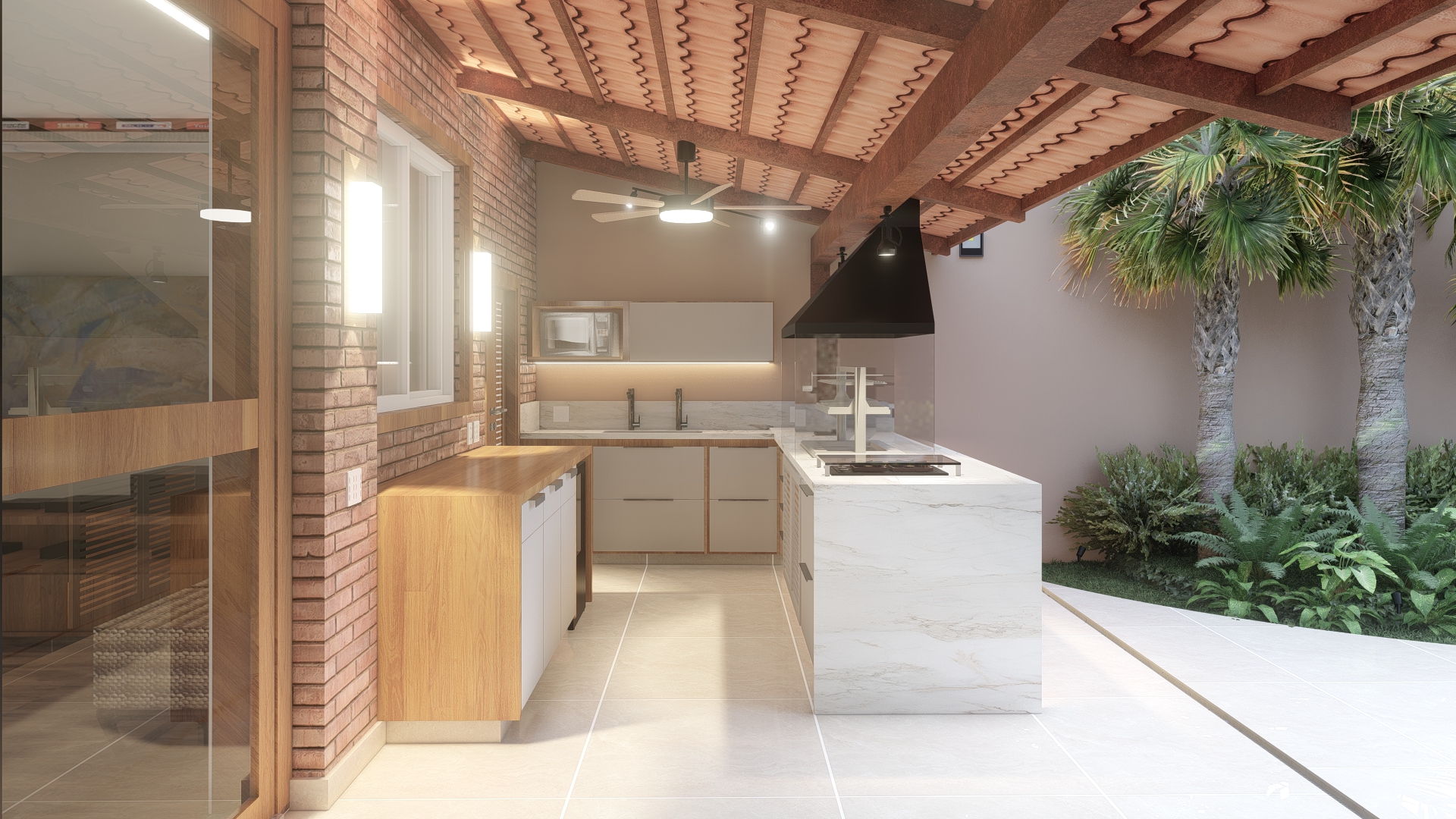 A área gourmet passou por uma reconfiguração, com foco em uma estética moderna e sofisticada. Foi implantada uma churrasqueira em ilha, que valoriza a integração dos espaços e proporciona maior funcionalidade para o uso social. A marcenaria planejada foi destacada com acabamentos em LED embutido.