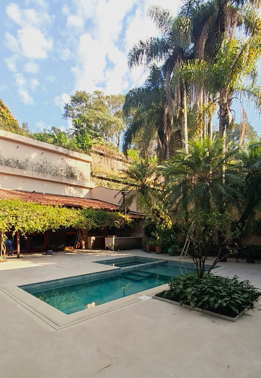 Na área da piscina, foi realizada a total substituição do piso e a reformulação do formato da piscina, que ganhou um spa integrado. O desenho do piso externo também foi redesenhado, com linhas mais orgânicas e fluidas que acompanham e se integram ao novo projeto paisagístico, ganhando um novo piso.