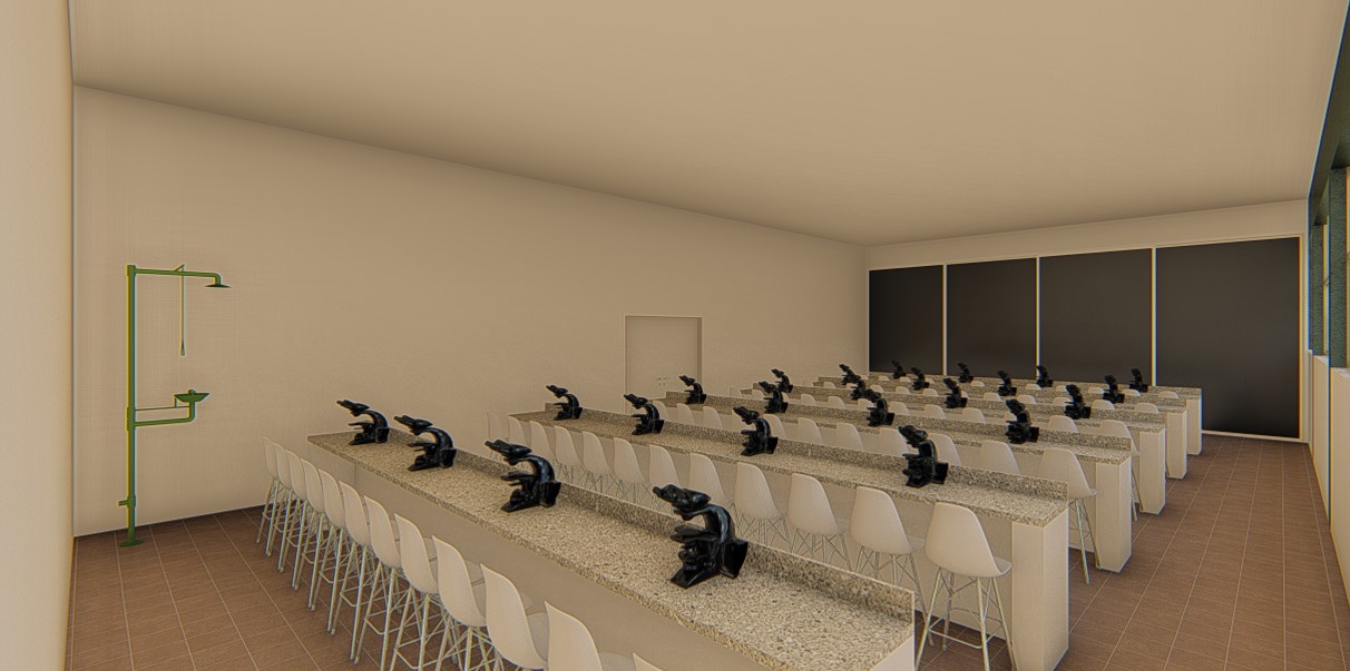 O laboratório de anatomia foi atualizado com um design limpo e organizado, utilizando mesas coletivas em acabamentos metálicos e bancos ergonômicos modernistas. A composição reforça a noção de compartilhamento e integração.