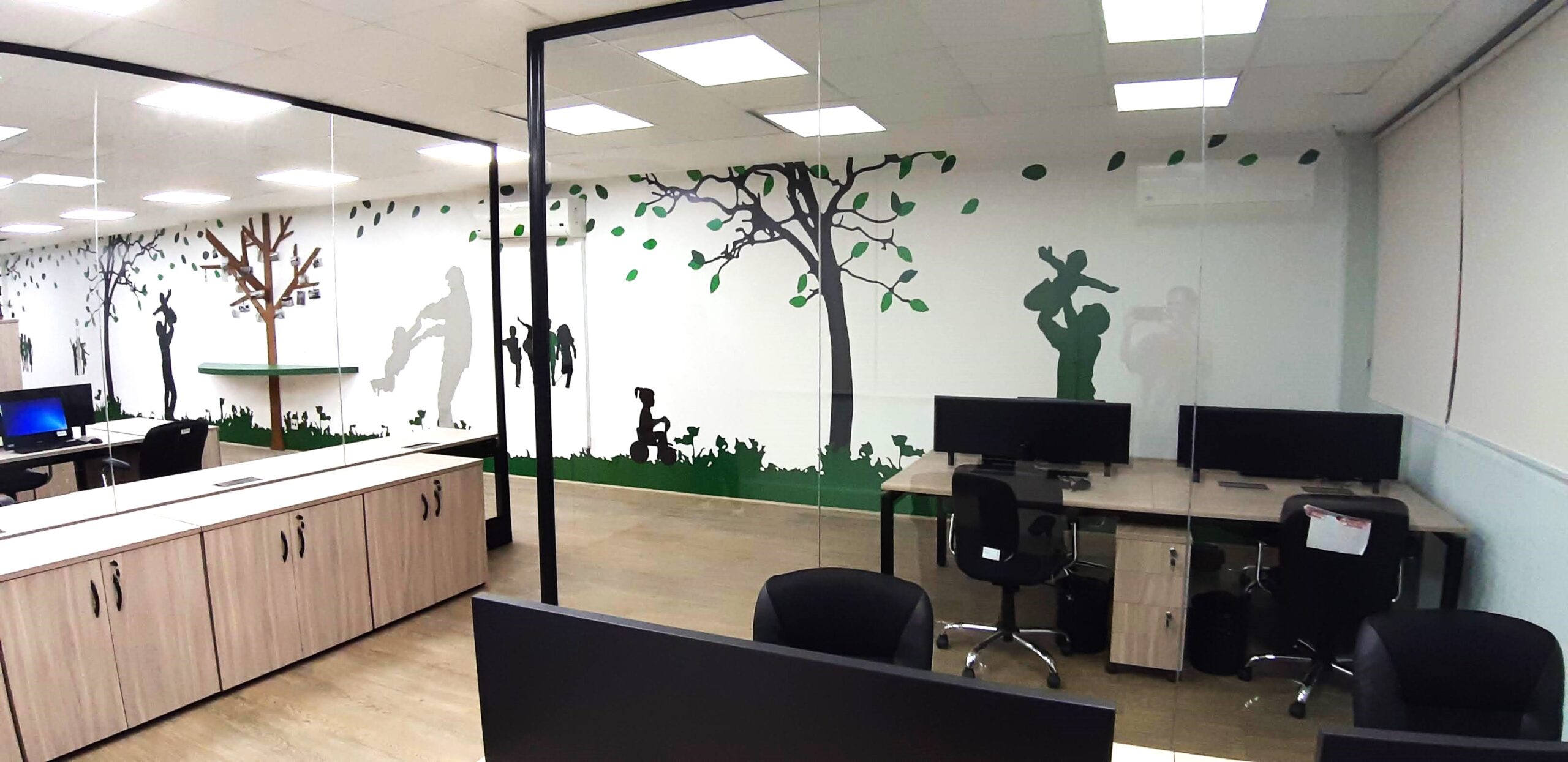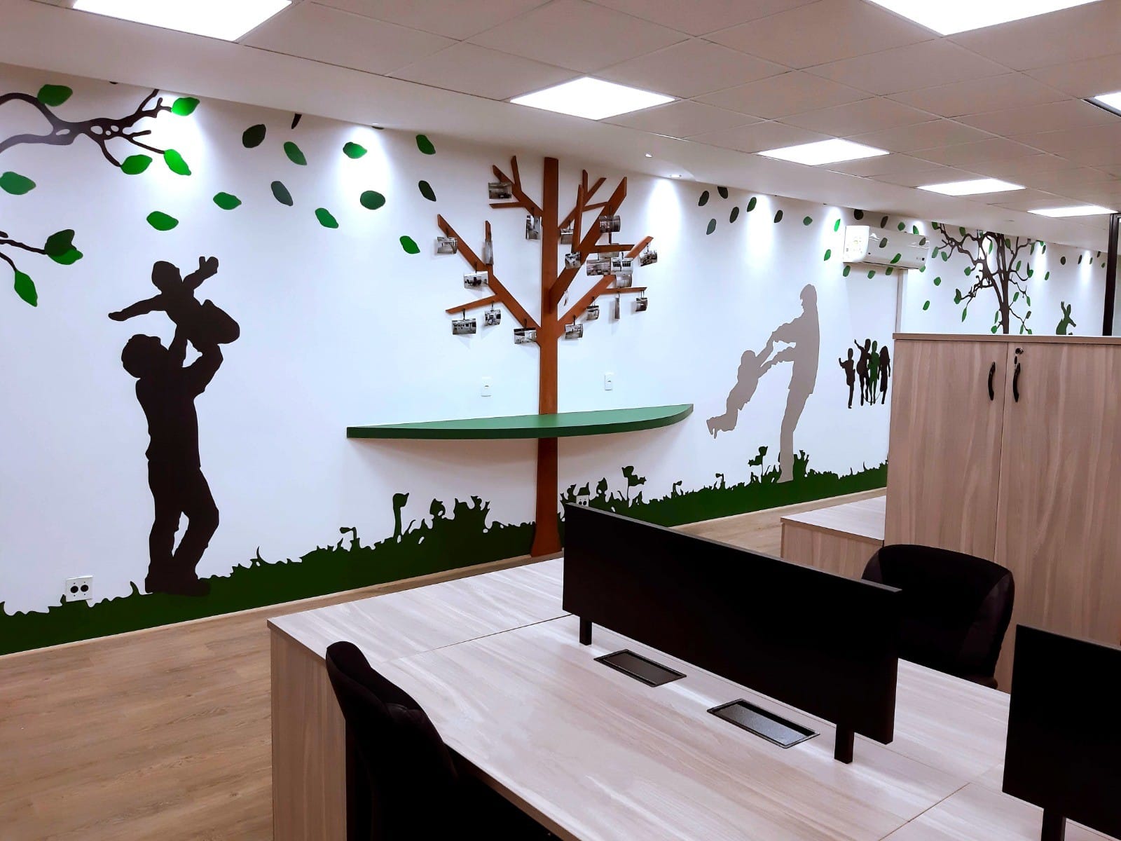 O projeto de revitalização desta sala corporativa foi concebido com o objetivo de criar um ambiente mais acolhedor, inspirador e colaborativo. A parede principal ganhou destaque com a aplicação de um papel de parede artístico que retrata árvores com folhas verdes esvoaçantes. Entre as árvores, destaca-se a silhueta de crianças brincando com seus pais, simbolizando harmonia, alegria e conexão — valores que também refletem a cultura da empresa.