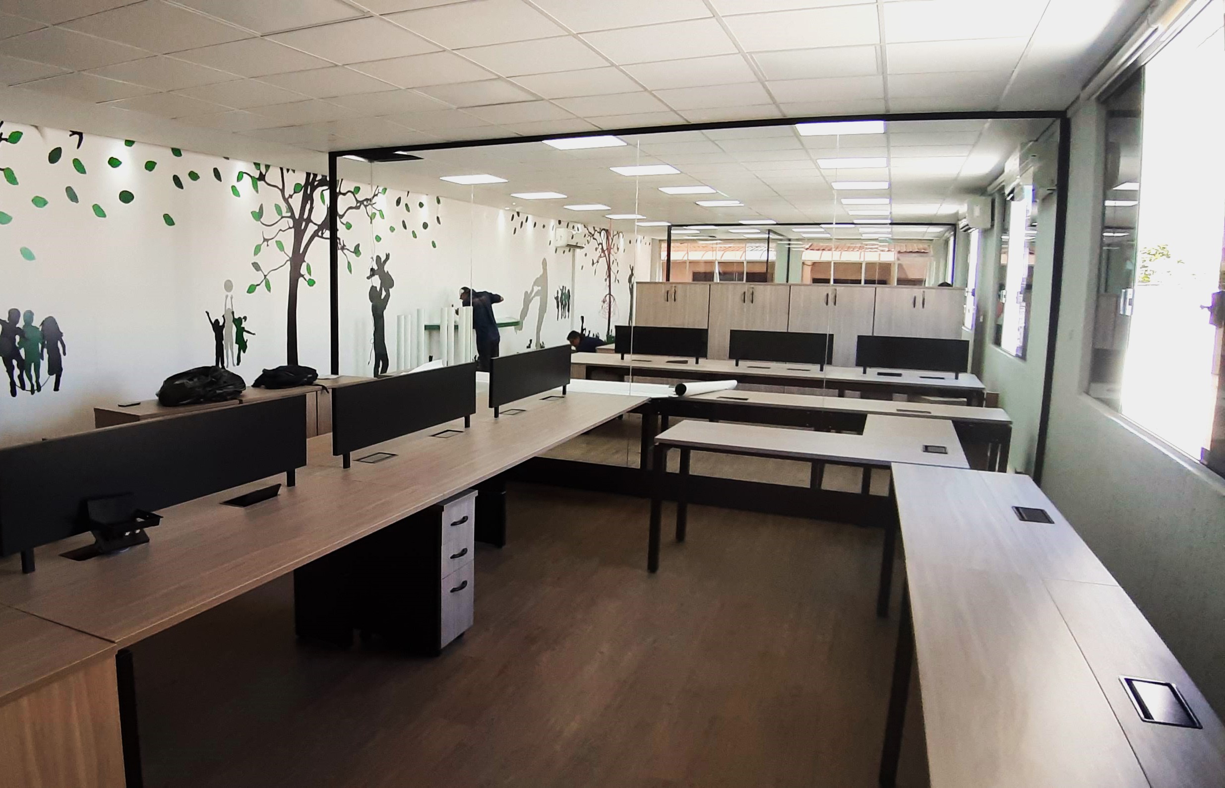 O espaço também foi reorganizado com a instalação de estações de trabalho coletivas, feitas sob medida em marcenaria, promovendo a integração entre os times e o uso eficiente da área disponível. A divisão entre setores foi feita por meio de paredes de vidro, garantindo transparência visual e a continuidade da iluminação, além de manter uma sensação de amplitude e modernidade