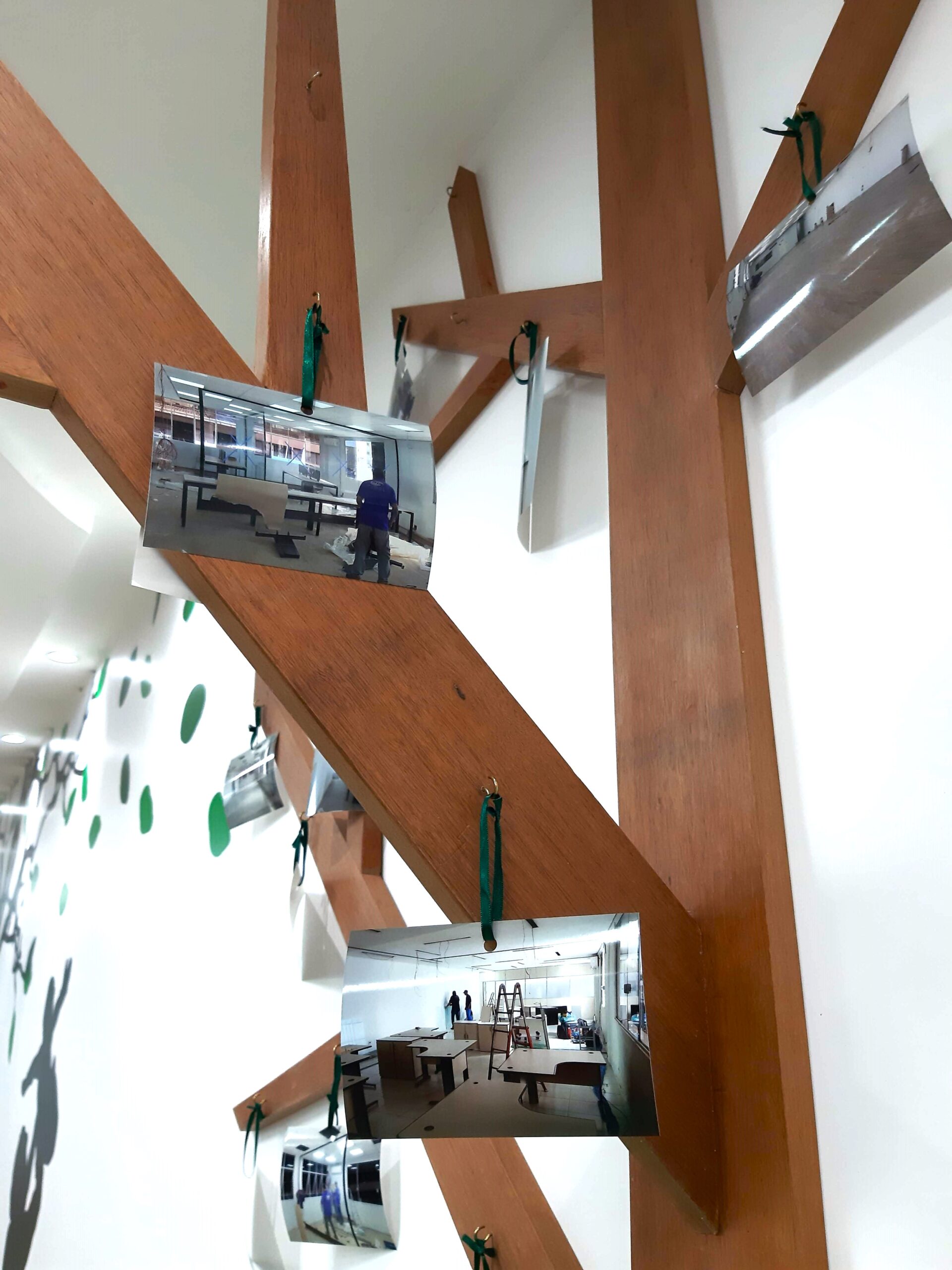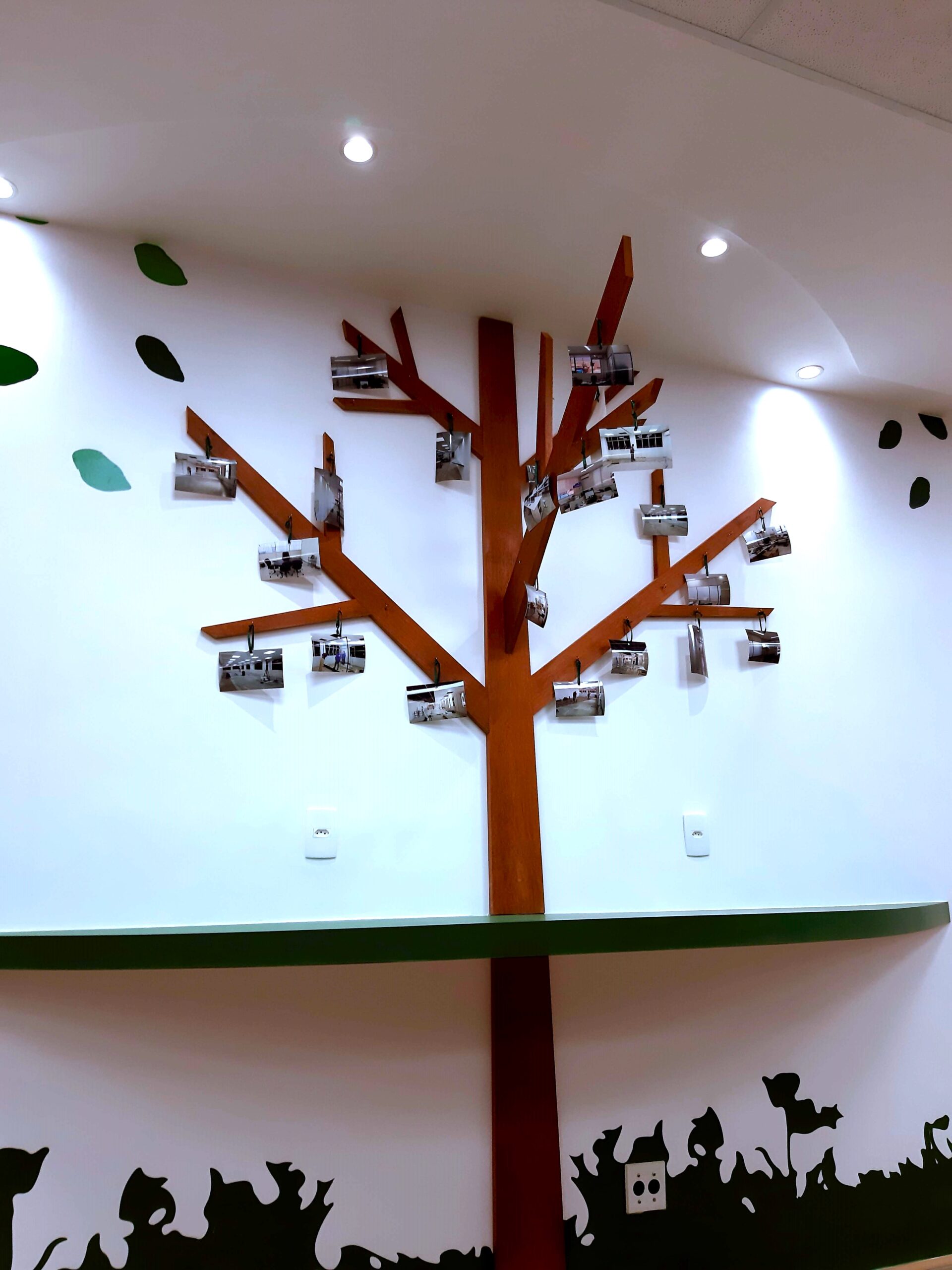 Para dar um toque ainda mais afetivo e personalizado, uma das árvores foi confeccionada em marcenaria, com galhos projetados especialmente para exibir fotos da equipe.