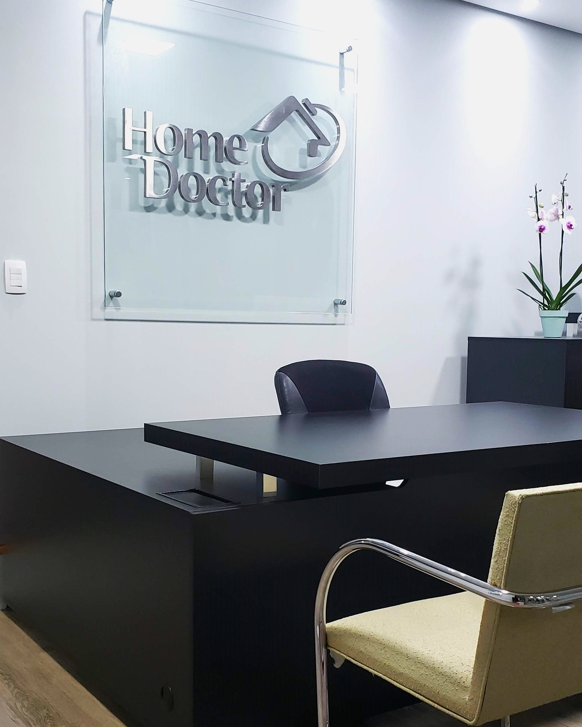 A recepção segue a mesma linguagem estética, com mobiliários pretos combinados a estofados claros, criando um equilíbrio visual e transmitindo acolhimento logo na entrada. Quadros estrategicamente posicionados introduzem toques de personalidade, quebrando a rigidez do preto e enriquecendo o ambiente com um ar contemporâneo.