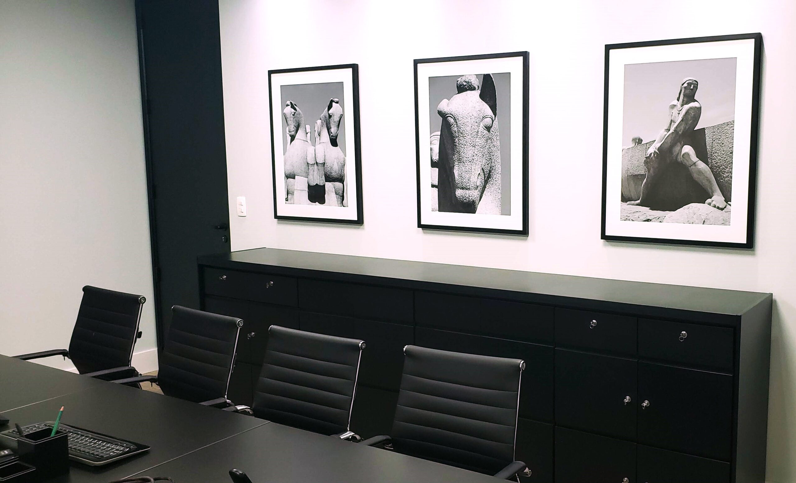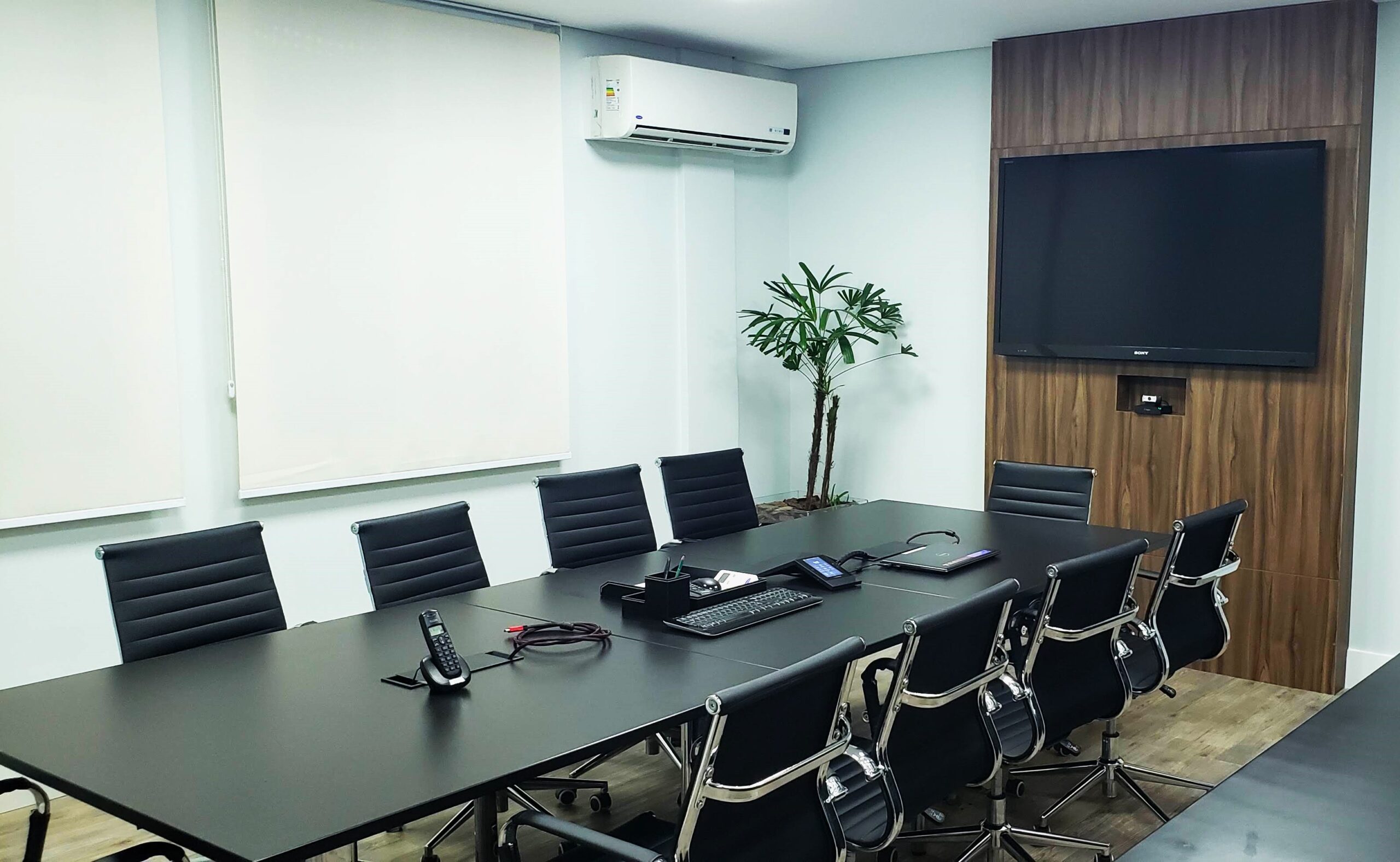 A sala de reunião mantém a paleta principal de móveis pretos e paredes claras, com destaque para uma faixa com revestimento em madeira que adiciona textura ao espaço
