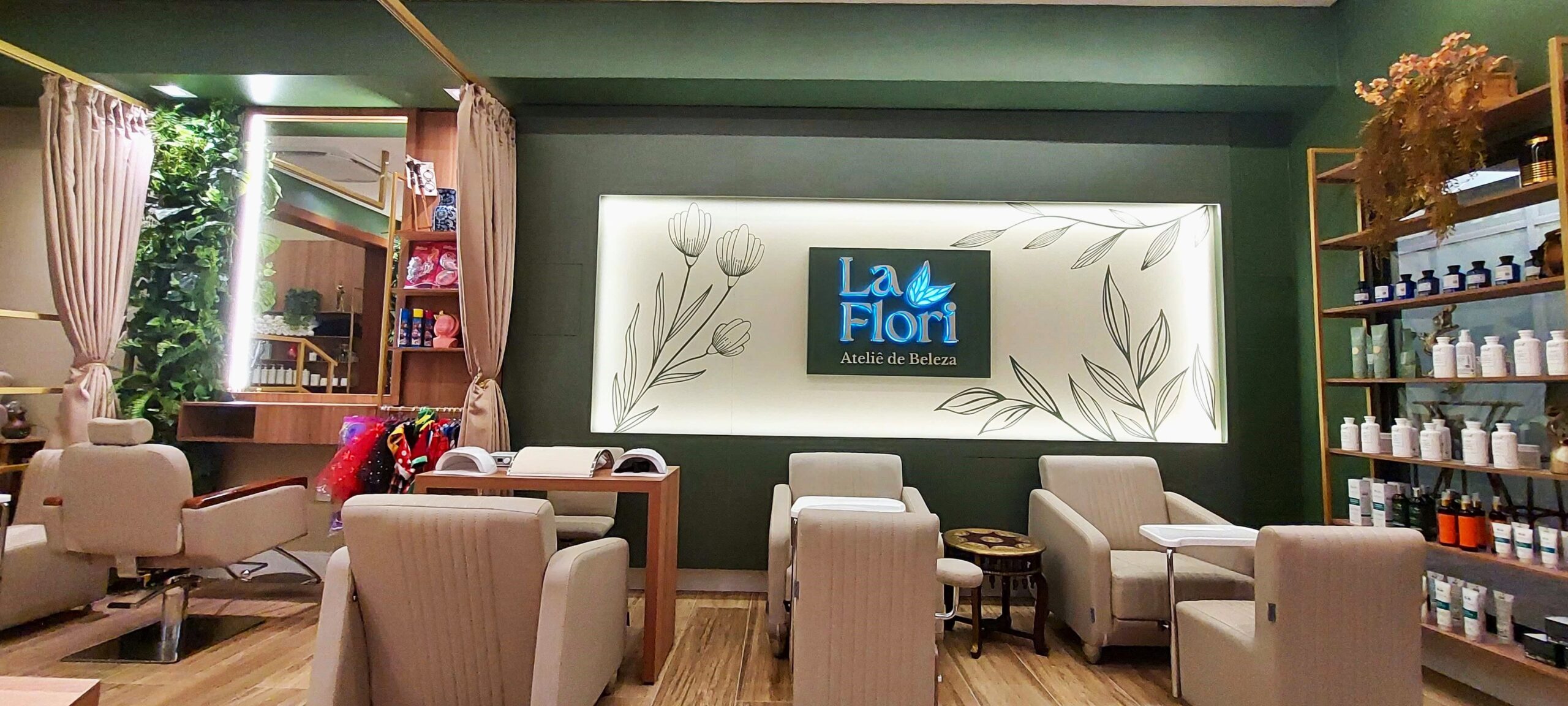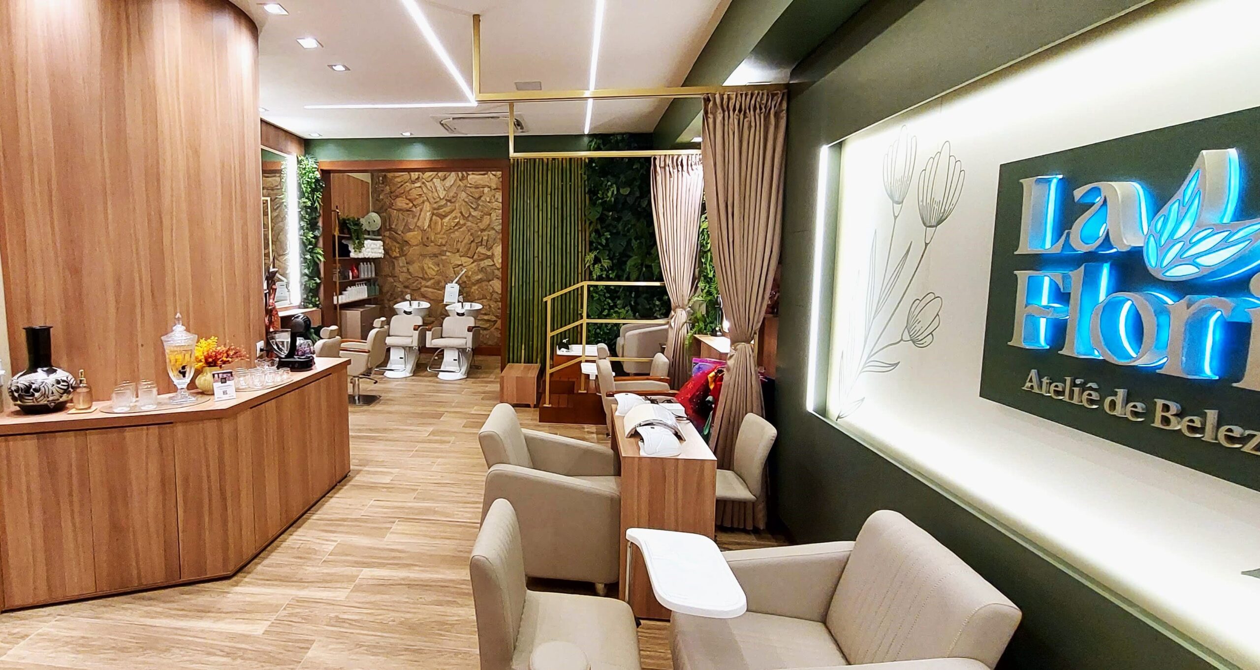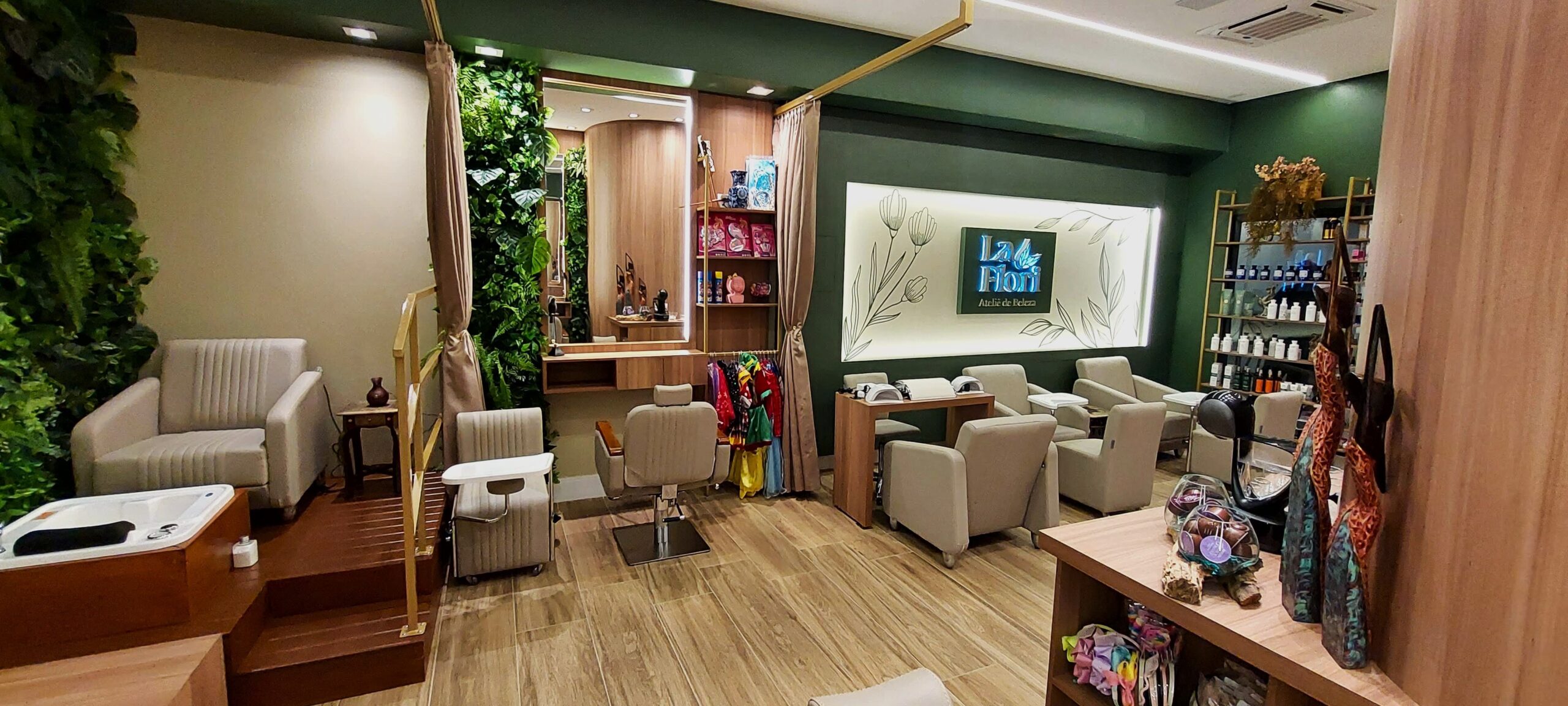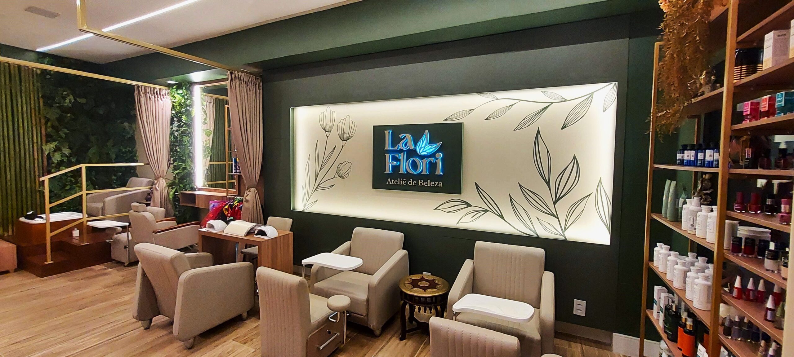 O La Flori alia elementos como madeira, pedras naturais e vegetação a um layout fluido e funcional, que promove relaxamento e eleva a experiência de clientes e profissionais. Cada detalhe, desde os relevos florais até a integração de acabamentos dourados, reflete cuidado e exclusividade.