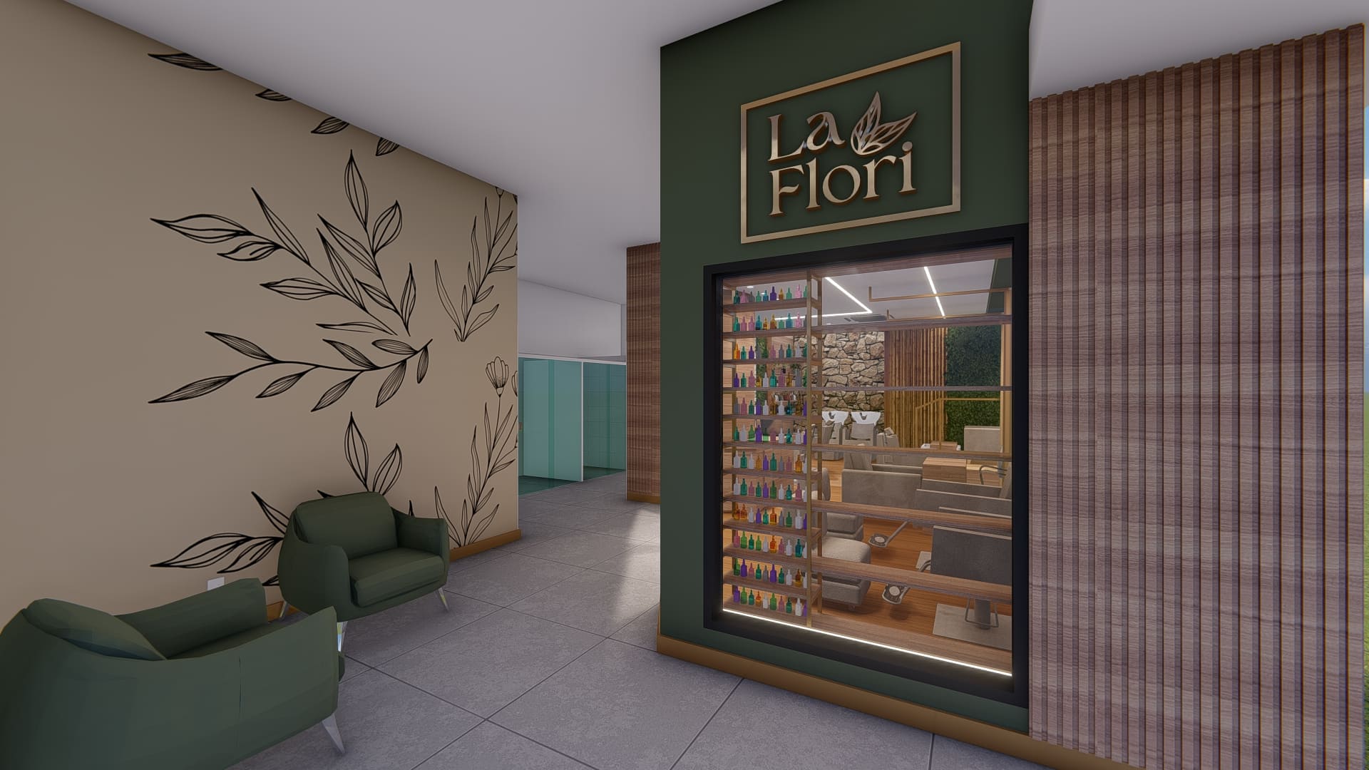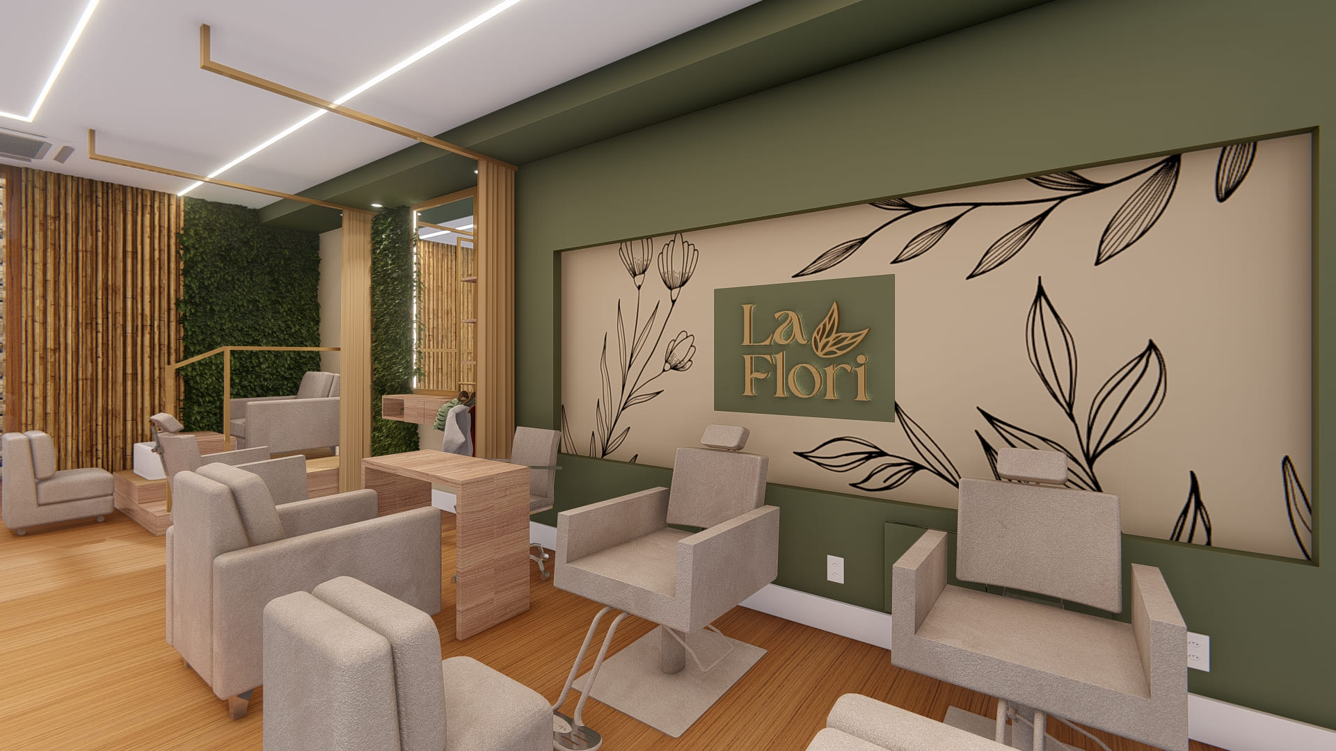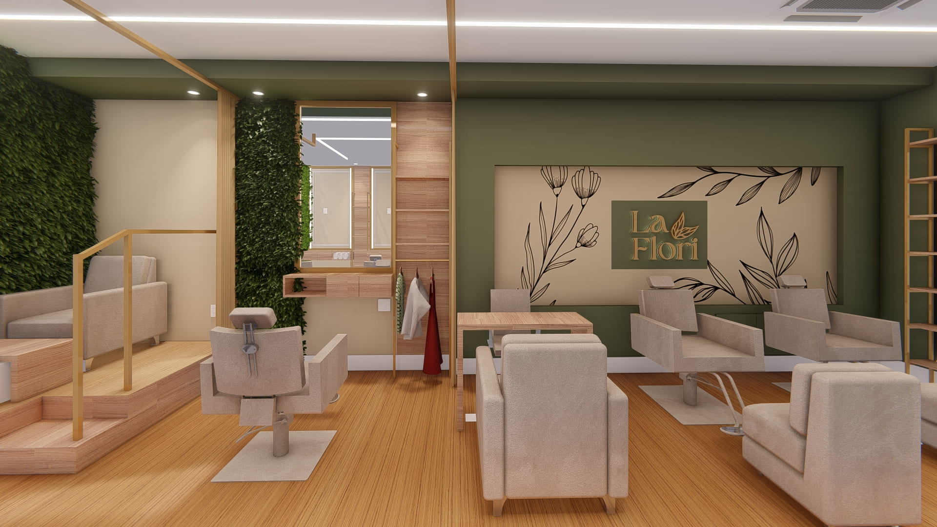 O La Flori alia elementos como madeira, pedras naturais e vegetação a um layout fluido e funcional, que promove relaxamento e eleva a experiência de clientes e profissionais. Cada detalhe, desde os relevos florais até a integração de acabamentos dourados, reflete cuidado e exclusividade.