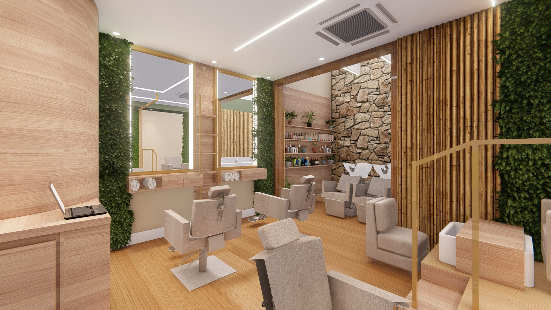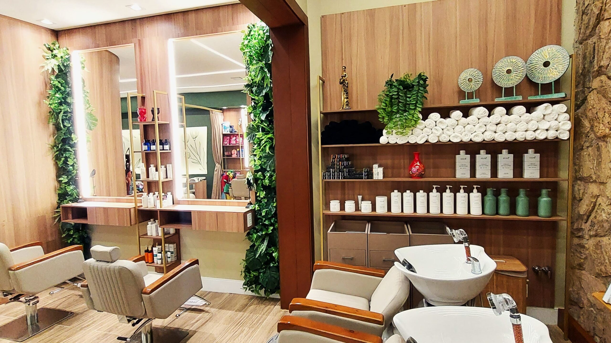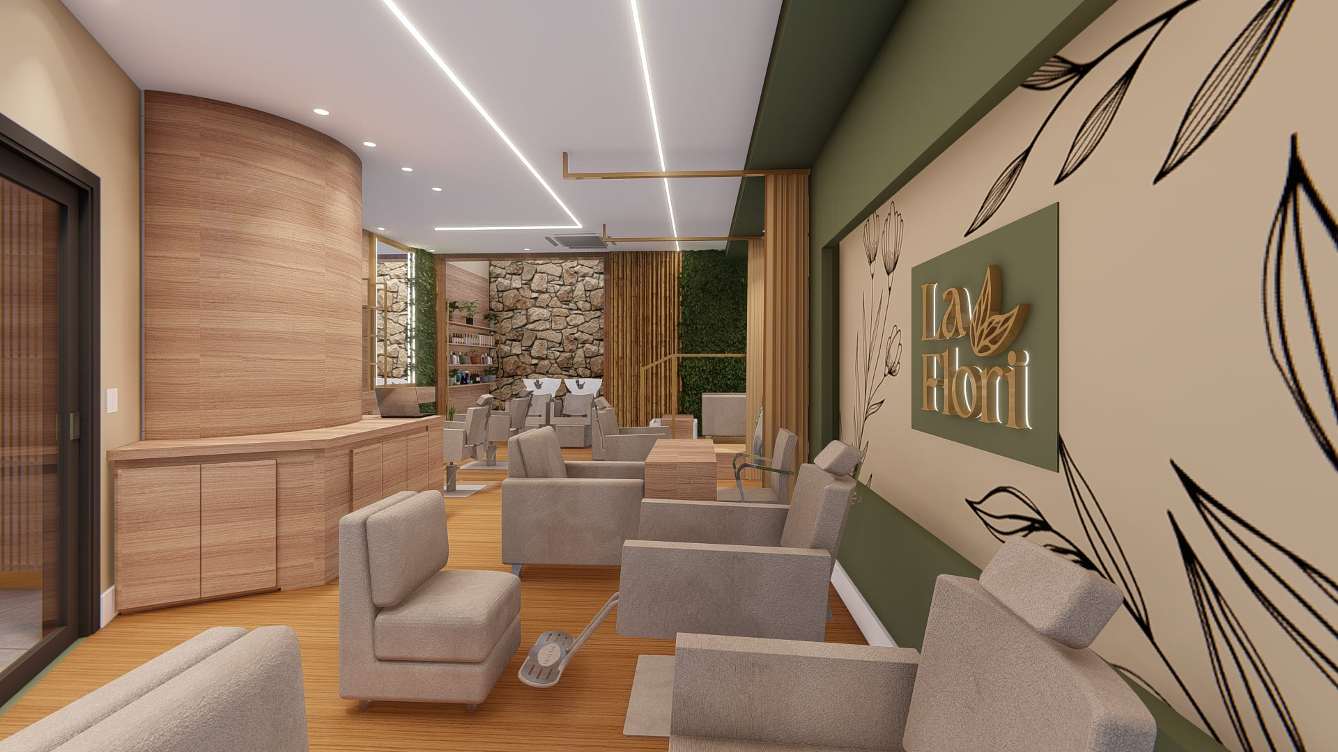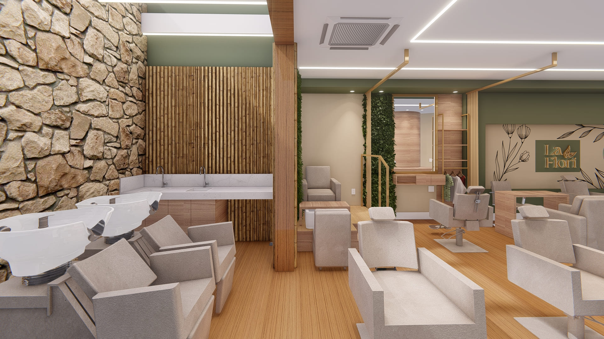 O La Flori alia elementos como madeira, pedras naturais e vegetação a um layout fluido e funcional, que promove relaxamento e eleva a experiência de clientes e profissionais. Cada detalhe, desde os relevos florais até a integração de acabamentos dourados, reflete cuidado e exclusividade.