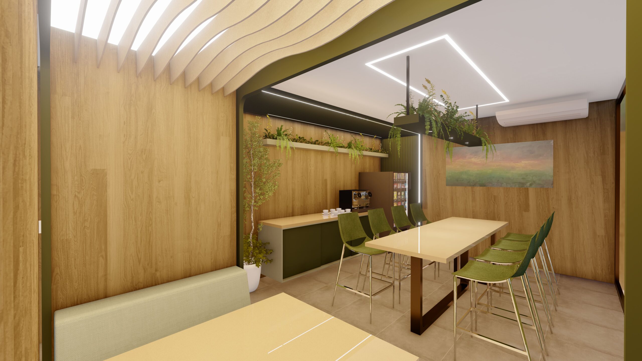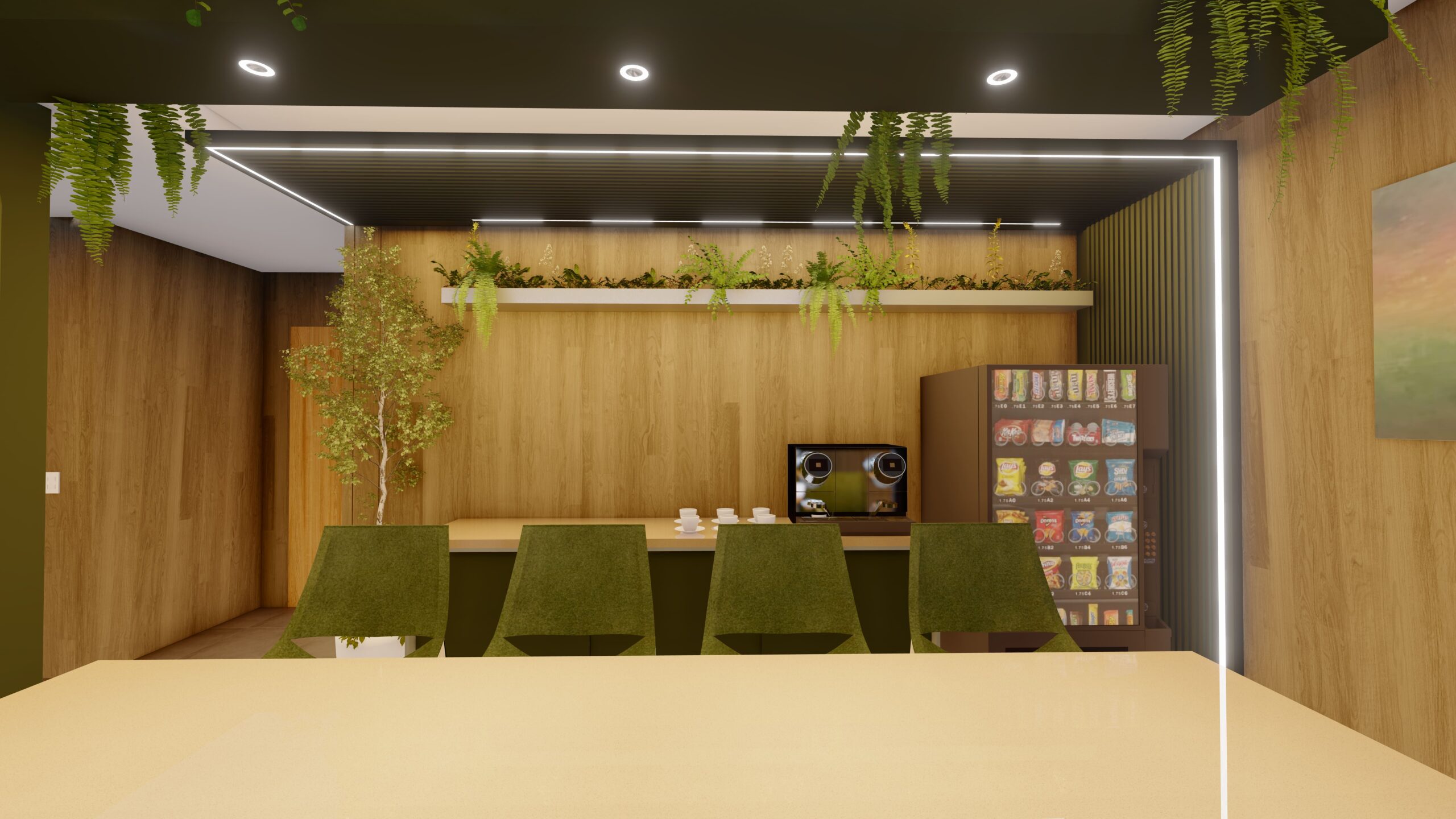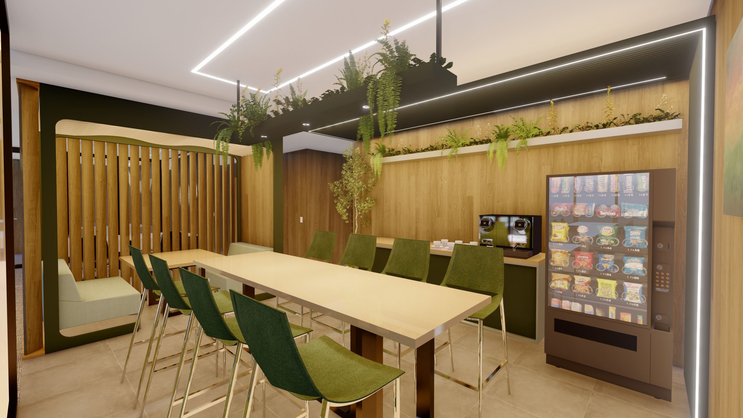 Este projeto propõe uma nova configuração para espaços de convivência em ambientes corporativos. Com uma paleta de tons terrosos e verdes, o ambiente integra áreas de convivência e espaços compartilhados destinados a refeições e encontros informais. A iluminação linear embutida no teto e nas estantes destaca os elementos arquitetônicos e contribui para a composição visual contemporânea.