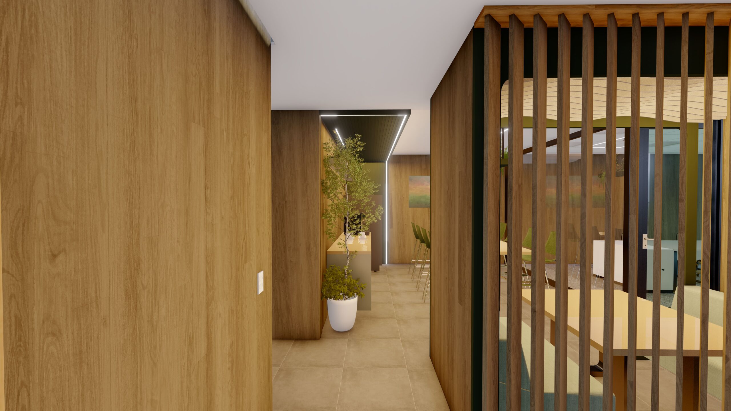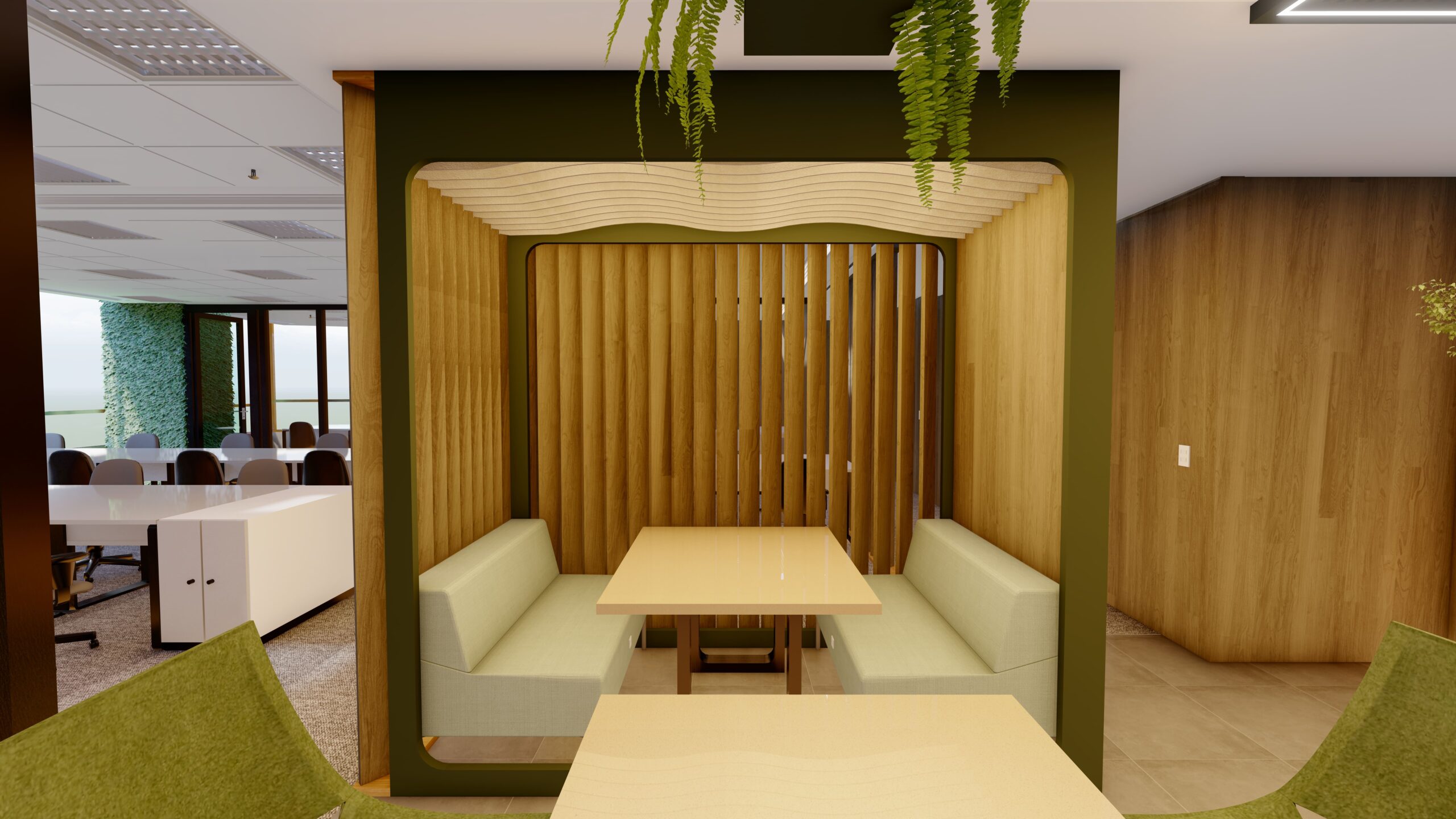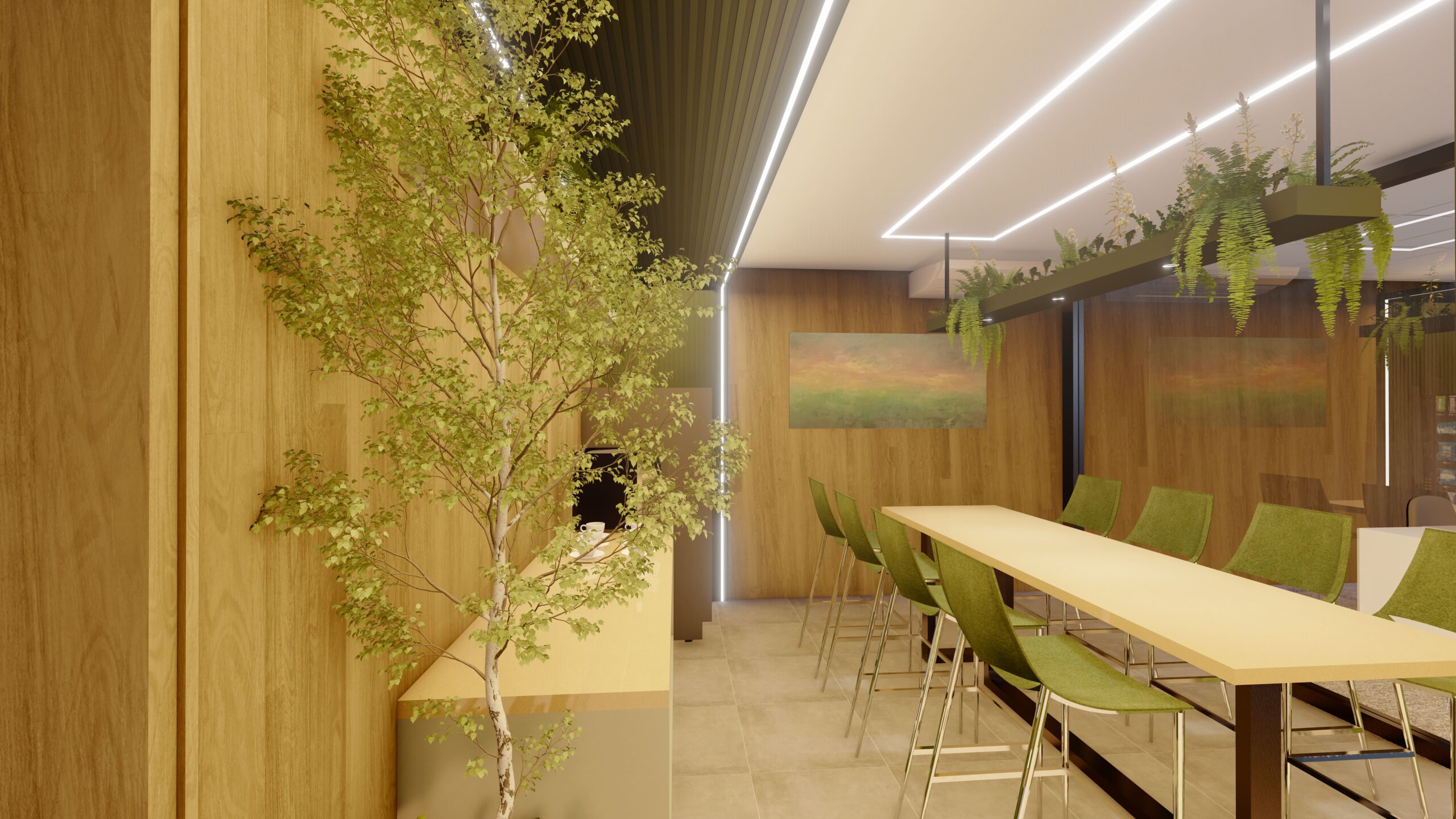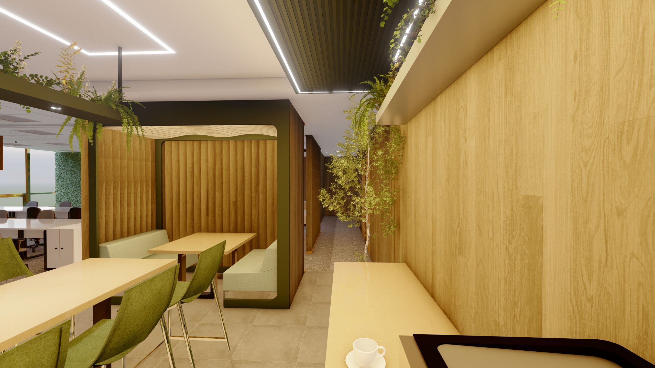 Este projeto propõe uma nova configuração para espaços de convivência em ambientes corporativos. Com uma paleta de tons terrosos e verdes, o ambiente integra áreas de convivência e espaços compartilhados destinados a refeições e encontros informais. A iluminação linear embutida no teto e nas estantes destaca os elementos arquitetônicos e contribui para a composição visual contemporânea.