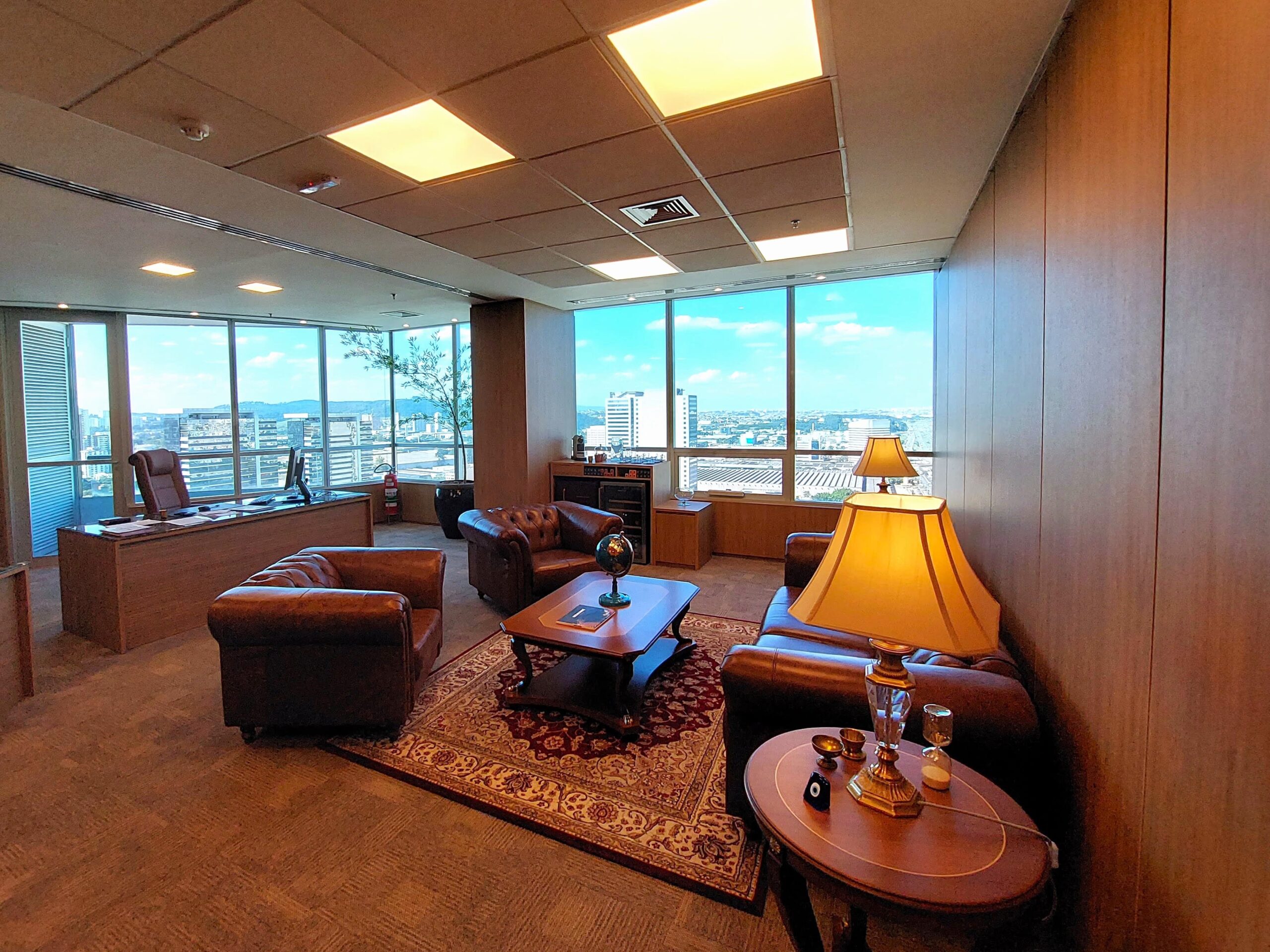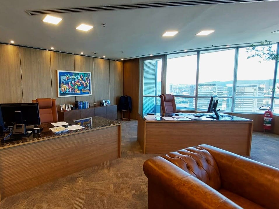 A sala da diretoria apresenta uma atmosfera mais sóbria e refinada. Elementos clássicos como revestimentos em madeira nas paredes, estofados em couro marrom escuro e detalhes elegantes compõem um ambiente com forte identidade visual, transmitindo autoridade, tradição e sofisticação.