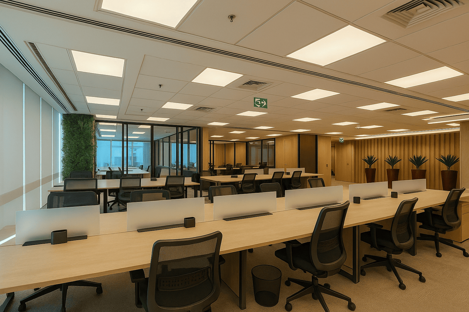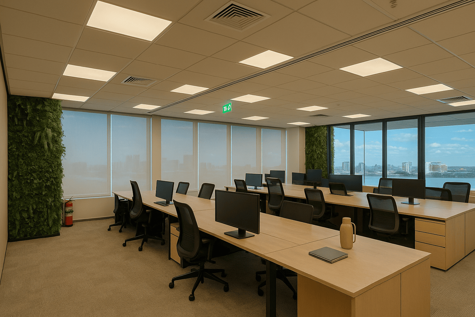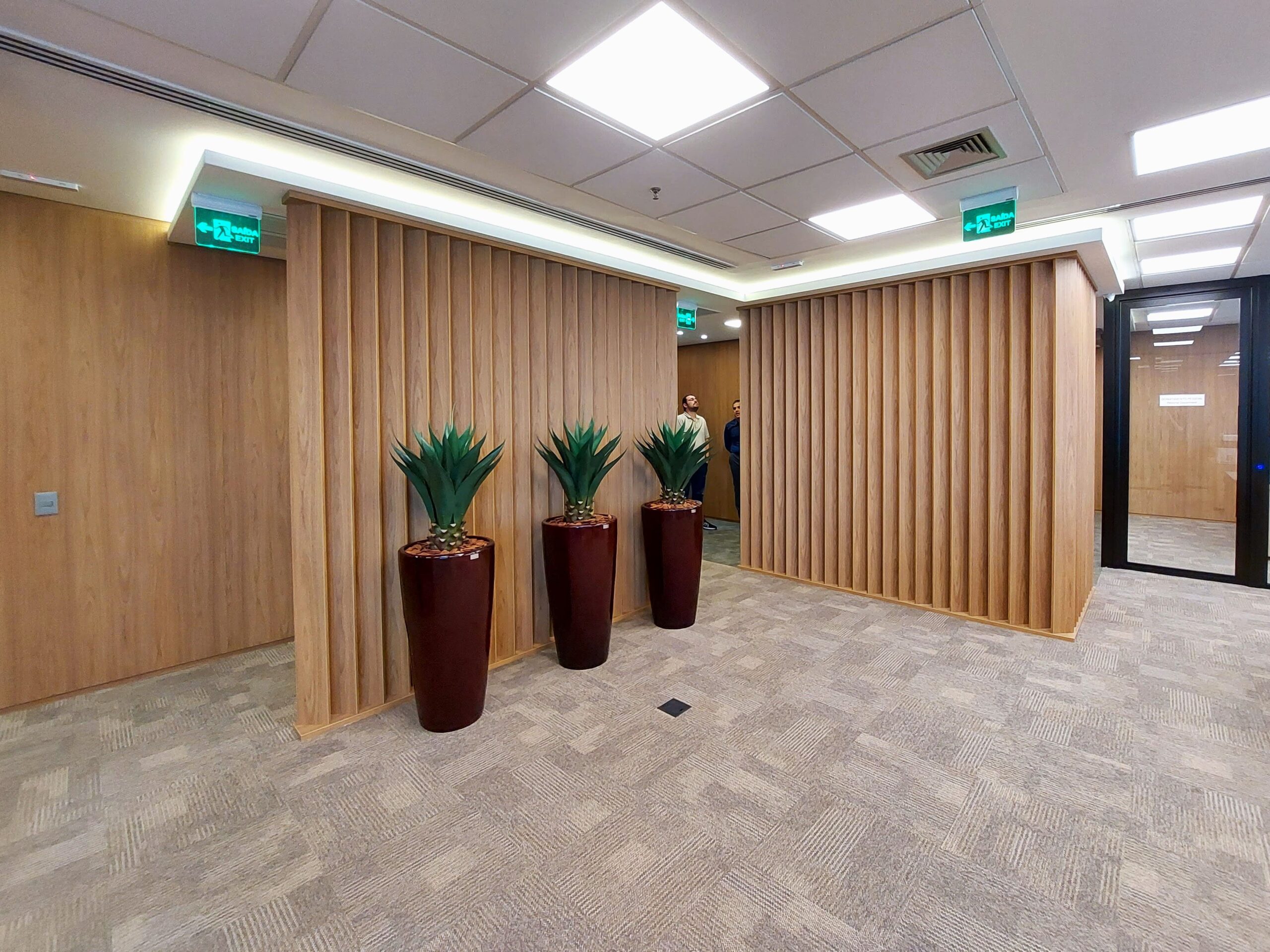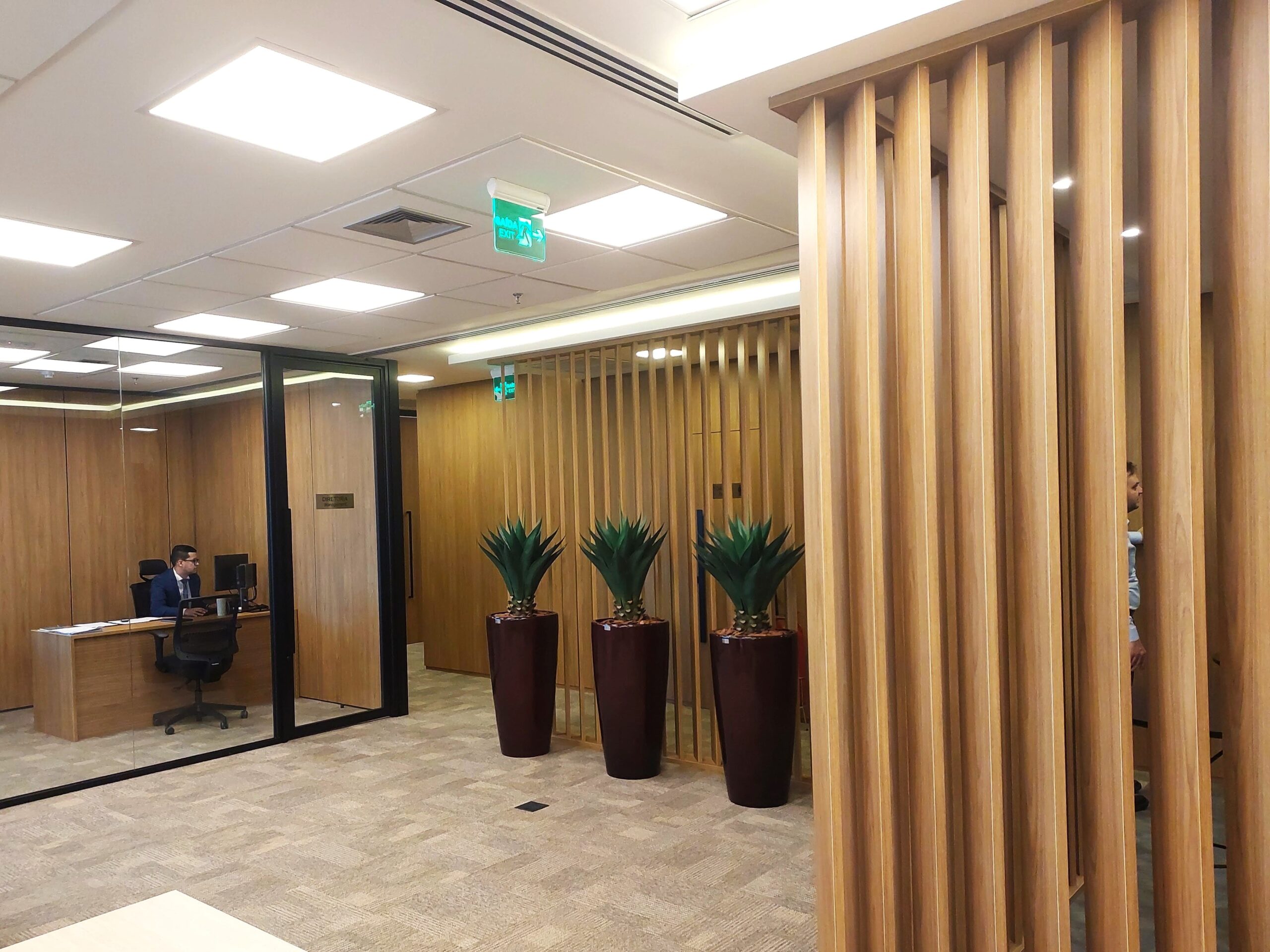 Foram incorporados painéis verdes estrategicamente posicionados, que introduzem equilíbrio ao ambiente e proporcionam bem-estar aos usuários.